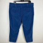 Dark blue corduroy pants feature two front slant pockets, one utility button closure pocket on thigh, and two rear patch pockets. Waistband has dual button closure with zip front fly. Pants are high rise with straight legs and belt loops. SIZE: 18 COLOR: Blue MATERIAL CONTENT: 75% cotton, 24% polyester, 1% elastane STYLE: 12711AA COO: Bangladesh CARE: Machine wash CONDITION: Excellent pre-owned condition with no fading, stains, pilling, or holes/tears. Please see photos for details. FLAT MEASUREMENTS (approximate) Waist: 20" Inseam: 27” Rise: 11” If you have any questions, please don’t hesitate to ask. Thanks for viewing our listing! Cargo, utility, trending, comfortable, casual, work
