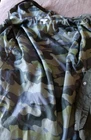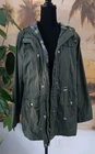 This Time and Tru rain jacket in size M features an interior camouflage pattern in olive green polyester. It has long sleeves, a zip and snap closure, and an adjustable cinch waist. The jacket is hooded. With practical pockets, this lightweight jacket is machine washable.
