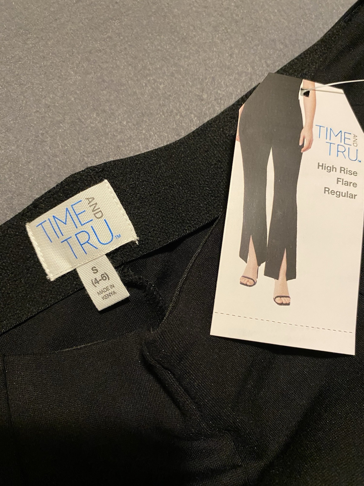 The "Time and Tru Women Flare Ponte Pants" in size Small are stylish and comfortable pants designed for women. The flared leg style adds a trendy touch to the classic black pants, making them versatile for various occasions. Made from a blend of nylon, spandex, and rayon, the ponte fabric offers a stretchy and flattering fit. These pull-on pants are easy to wear and are suitable for everyday wear or dressing up for a more polished look. Perfect for a size 4/6 Small, these pants are a great addition to any woman's wardrobe.