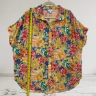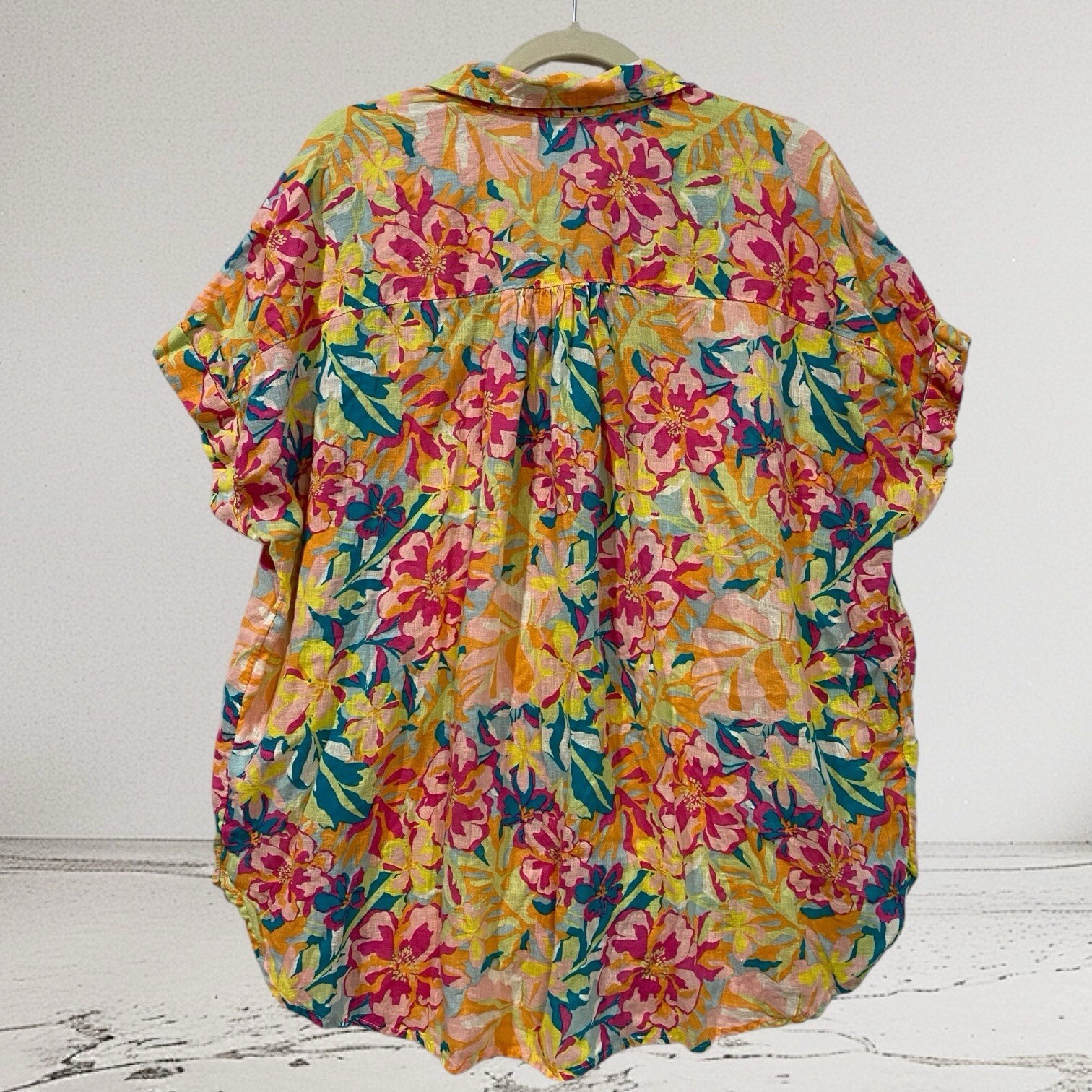 Time and Tru Women's XL Floral Tropical Button Front Linen Blend Cap Sleeve Top