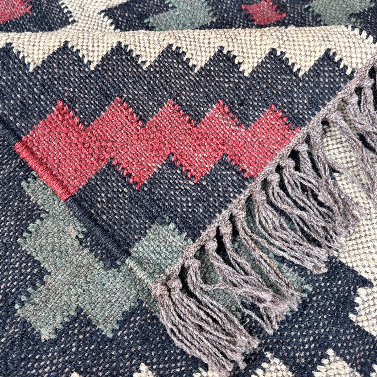 Add warmth and elegance to your space with this handmade wool and jute rug, crafted using age-old traditional weaving techniques. Every piece is created on a loom by skilled artisans, ensuring exceptional quality and attention to detail. ✔️ Premium Wool & Jute Blend – Made with strong natural wool and jute fibers for exceptional durability, rustic charm, and long-lasting beauty. ✔️ Reversible Design – Both sides feature the exact same pattern, giving you double the use and value. ✔️ Natural Dyes – Colors are rich, eco-friendly, and completely washable. No color bleeding or fading during washes. ✔️ Flat Weave & Fine Craftsmanship – Lightweight yet tightly woven, perfect for both modern and traditional décor. ✔️ Custom Orders Welcome – We can create this rug in any size or color as per your requirements. 📌 Note: If you prefer your rug without tassels or fringes, simply inform us. We will customize it for you. This rug is more than just a floor covering—it’s a handcrafted masterpiece designed to beautify your home. Perfect for living rooms, bedrooms, or any space that needs a touch of artisanal charm.