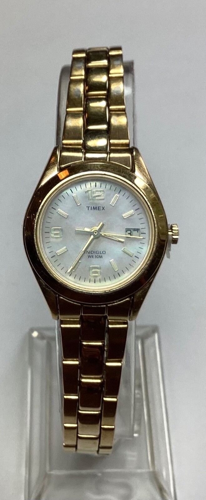 Timex Indiglo Women's Watch combines classic elegance with modern functionality. Its Gold Mother of Pearl Dial adds a touch of sophistication, complemented by the polished gold-tone stainless steel bracelet and case. The watch features a central second hand, date indicator, and 12-hour dial, all set within a durable quartz movement. Catering to both casual and formal occasions, this timepiece offers a versatile style. It boasts a water-resistant capability up to 30 meters, a secure fold-over push-button deployant closure, and a convenient backlight for visibility. The round watch face is framed by Arabic numerals and baton indexes, ensuring a clear and readable display. 1607