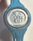 This Timex Ironman Light Blue Silicone 50 Lap Indiglo Watch is perfect for women who love sporty styles. With a 38mm rubber case and a two-piece silicone and rubber strap, this wristwatch is both durable and comfortable to wear. It features a digital display with Arabic numeral indices, a month indicator, a date indicator, and a day indicator. The watch is powered by a quartz movement and has a screwback caseback. The bezel color is blue, and the dial color is silver. This watch is suitable for wrist sizes between 7.26-7.5 inches and has a band width of 12mm. New Battery