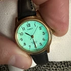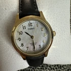 This elegant Timex wristwatch for women features a stunning gold tone metal case with a beautiful mother of pearl dial pattern. The watch is powered by a reliable quartz movement and has a 30 meter (3 ATM) water resistance, making it perfect for everyday wear. The black leather band complements the gold tone case and adds a touch of sophistication to the overall design. The watch also features Arabic numeral indices, a 12-hour dial, backlight, and a round watch shape with a 25 mm case size. It comes with a new battery and does not have papers or original packaging. This Timex watch is a perfect addition to any watch collection and is suitable for both dressy and casual occasions.