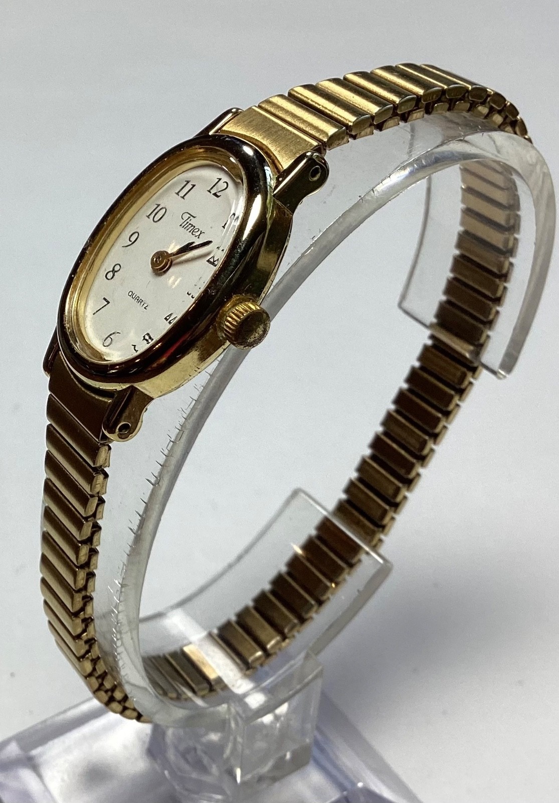 This Timex Women's Watch features a gold tone oval stretch band with a new battery, making it a stylish and functional accessory. The quartz movement ensures accurate timekeeping, while the dress/formal and casual styles cater to different occasions. The watch includes Arabic numerals on the indices, a polished gold case finish, and a classic analog display. With a sleek design and reliable features, this Timex Vintage Quartz watch is perfect for everyday wear or special events. 1799