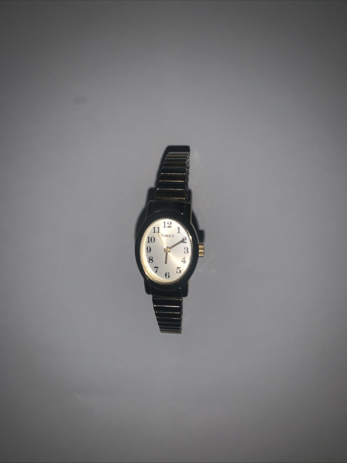 This Timex women's wristwatch features a quartz movement and is water-resistant up to 30 meters (3 ATM). The watch has Arabic numerals as indices and is made of stainless steel for the band, case, and bezel. The dial color is white and the watch has a round shape. The Timex watch is casual and classic in style, making it suitable for everyday wear. It does not come with papers or original packaging.