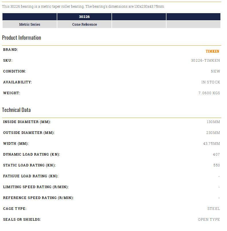Timken 30230 Taper Roller Bearing 150x270x45mm Single Unit NN