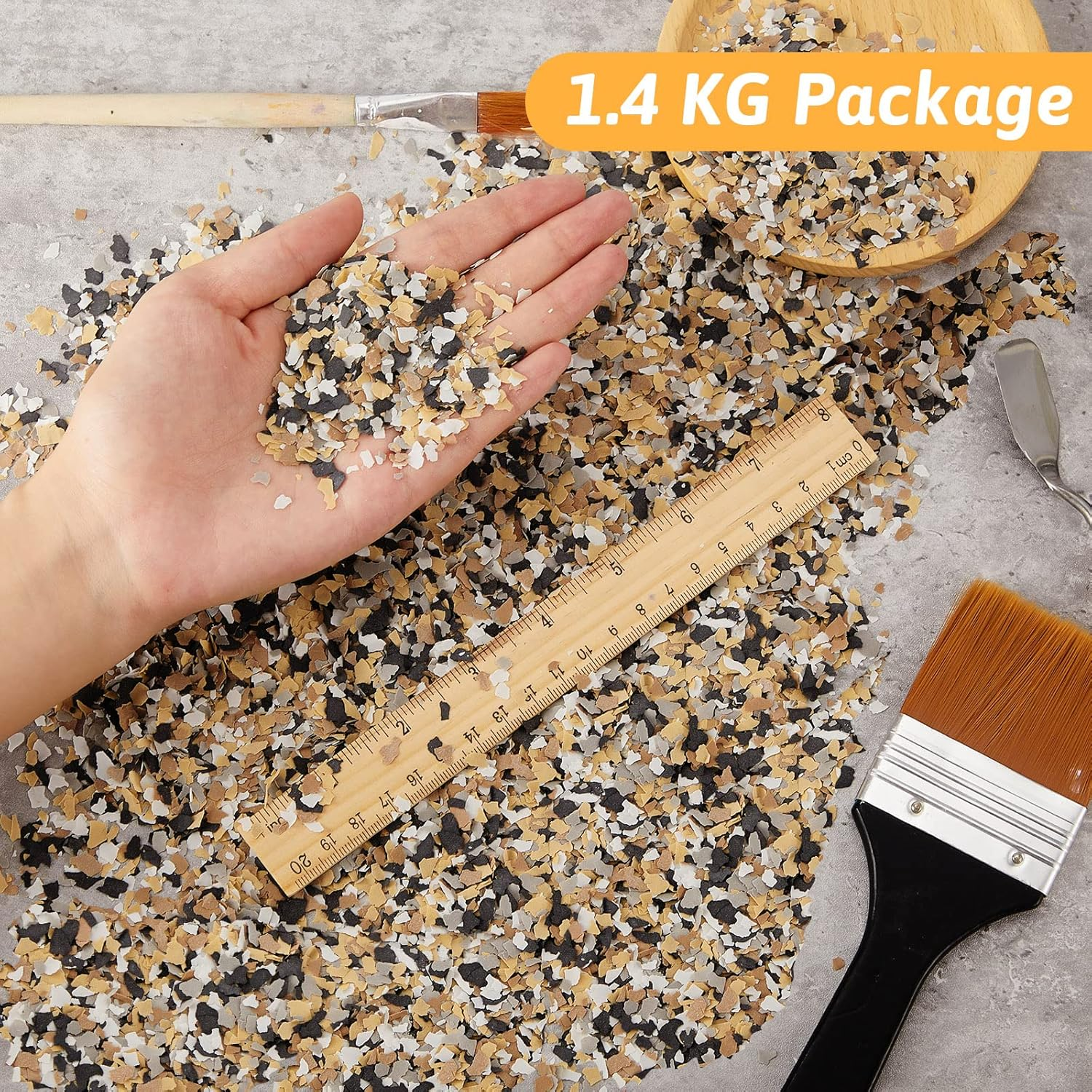 Store New Arrivals Add to Favorite View Feedback Contact Timtin 1400 G/ 3.08 Lb Blend Color Chips Concrete Floor Coatings Decorative Paint Flakes for Walls Garage Floor Paint Interior Exterior Floors (Black, White,Gray, Light Yellow, Light Coffee) Description Unit Count 49.3836 Ounce Batteries Required? No Finish Gloss Item Volume 1.4E+3 Milliliters Brand Timtin Coverage Lightweight Package Information Box Finish Type Gloss Specific Uses For Product Interior/Exterior Paint Type Epoxy Included Components Decorative Chips Item Package Quantity 1 Indoor/Outdoor Usage Indoor, Outdoor Water Resistance Level Water Repellent Item Weight 3.09 pounds Surface Recommendation Floors, Walls Special Features Odor Blocking Special Feature Odor Blocking Color Black, White,Gray, Light Yellow, Light Coffee Item Form Powder Is Waterproof False Manufacturer Timtin Product Dimensions 8.66 x 8.66 x 2.36 inches Size Small Vibrant Colored Flakes Kit: you will receive a pack of flooring decorative chips of 1400 g/ 3.08 lb, including several different simple colors, the enough quantity can meet your various decorative needs Reliable and Lightweight: the epoxy floor flakes are made of natural rock slices, small and lightweight; Reliable and sturdy, each piece of the floor flakes is about 2-4 mm/ 0.08-0.16 inch, providing you with different sizes to match, can serve you for a long time Decorative Surface Decor: the blend flakes for epoxy floor can help to cover the marks and dirt on the wall and floor, and make your wall and floor more charming and beautiful, achieving the nice decorative effect Convenient to Use: you can sprinkle a layer of concrete floor coatings on the ground, and then apply epoxy coating to complete the construction, to achieve a permanent adhesion, easy for you to use Widely Applicable: the floor color chips are suitable for indoor and outdoor painting on floor and wall, which can be applied for garage, laundry room floors, basement, store floors, showrooms, restaurants and so on Features: Show your creativity: The colorful floor flakes allow you to play full of your creativity to decorate your floor, table top and other surfaces that need to be painted. You can sprinkle the decoration chips randomly according to your preference or arrange them in creative combinations. Practical gifts: The stone chips for painting are nice presents to people whose houses are being renovated, offering a gift of novelty and increasing the taste of house decoration. Specifications: Material: rock slices Color: as picture shown Size: 2-4 mm/ 0.08-0.16 inch Weight: 1400 g/ 3.08 lb Package includes: 1 Pack of decorative floor chips Notes: Please allow slight dimension error due to manual measurement. Please allow slight color differences due to different monitors. Small parts are included, please keep away from children under 3 years old. ABOUT US We offer the best prices around on high quality products. Our E-store includes media such as books, movies, music and games while offering electronics, toys, sporting apparel, clothing, tools, general home, garden items and more. SHIPPING We are always working hard to ensure your package arrives as soon as possible. Please understand that some factors like weather, high postal traffic, and the performance of shipping companies are outside of our control. We offer free shipping to the lower 48 states and ship within 2 business days of payment, usually sooner. We do not accept P.O. Boxes. Please provide a physical address. RETURNS We offer a 30-Day Return Policy on items which you are not completely satisfied with. You have the option for a full-refund or an exchange of the item. No returns are available on items shipped outside of the USA. PAYMENT We accept PayPal. CONTACT US This page content is yet to come Please ad us to your favorite seller and visit again later Thank You CUSTOMER SATISFACTION We try our very best to make sure every customer is completely satisfied. If there's a problem, message us! We're happy to help.