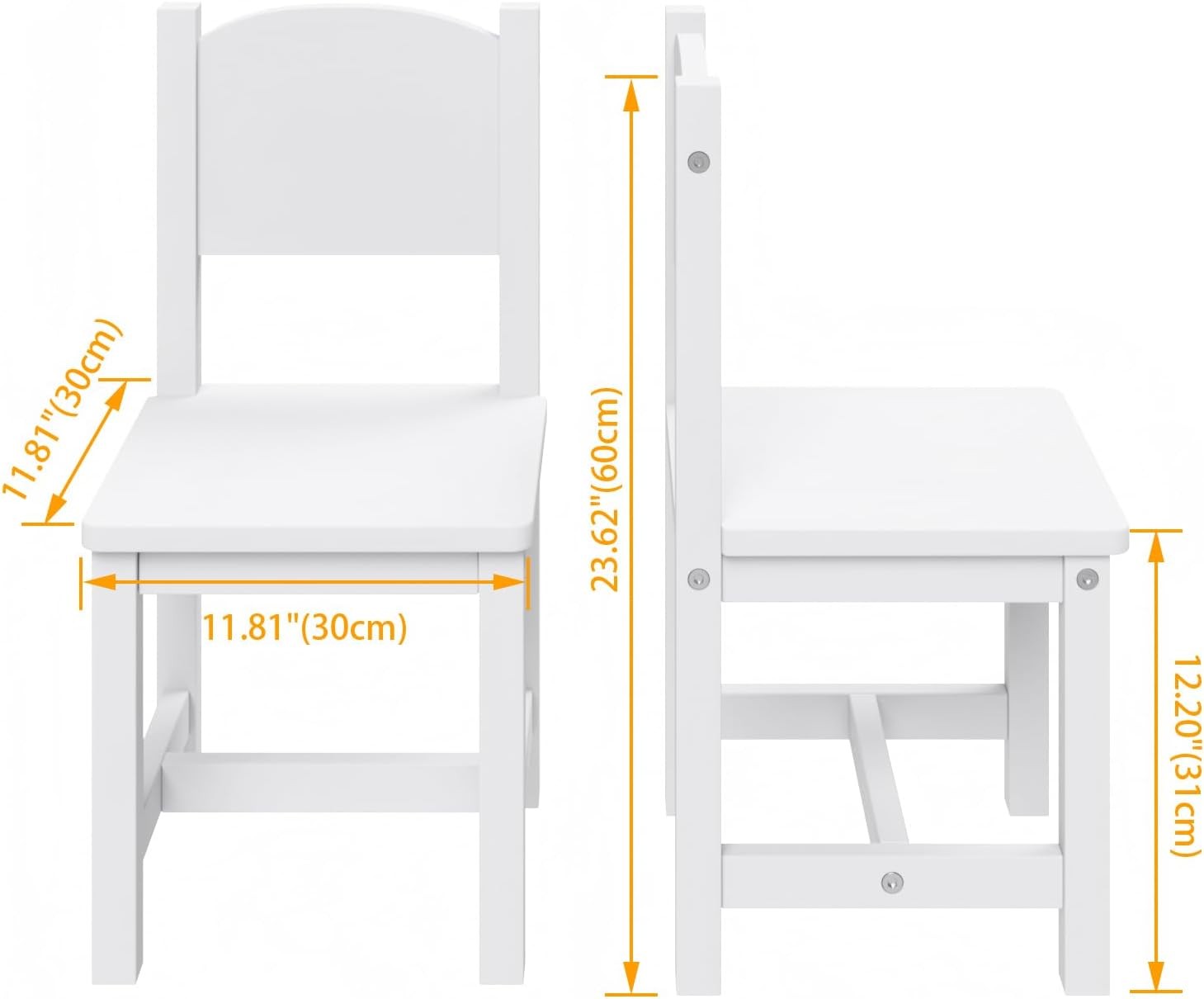 Timy Toddler Wooden Chair Pair, Kids 11.8D x 11.8W x 23.6H in, White Product Details Brand: Timy Color: White Product Dimensions: 11.8"D x 11.8"W x 23.6"H Size: 11.8D x 11.8W x 23.6H in Back Style: Slat Back Special Feature: Sturdy Product Care Instructions: Wipe Clean Unit Count: 2.0 Count Recommended Uses For Product: Reading Style: Modern Pattern: Solid Room Type: Bedroom, Living Room Age Range (Description): Child Included Components: User Manual Arm Style: Armless Surface Recommendation: Hard Floor Indoor/Outdoor Usage: Indoor Furniture Finish: wood Seat Height: 12.2 Inches Seat Depth: 11.81 inches Leg Style: Tapered Leg Reclining Position Count: 1 Is Foldable: No Chair Backrest Width: 11.8 Inches Form Factor: Wood Manufacturer: Timy Item Weight: 13.02 pounds Country of Origin: China MaterialFrame Material: Engineered Wood, WoodMDF Seat Material TypeMaximum Weight Recommendation: Wood81 Pounds Wide Application: The Kids chairs size fit most Kid's table.Ideal for your toddler's bedroom, playroom or the living room. Sturdy Construction: The chair pair made of sturdy solid wood and MDF. Durable and easy to assemble. Safe for Kids: The environmentally friendly paint is non-toxic. Smooth surfaces and rounded corners to avoid any potential scratches. Ideal Size: 11.8L x 11.8W x 23.6H inch,includes 2 chairs. Age Range: Timy toddler chair pair specifically designed for younger children, perfect choice for ages 3 to 8 years kids.