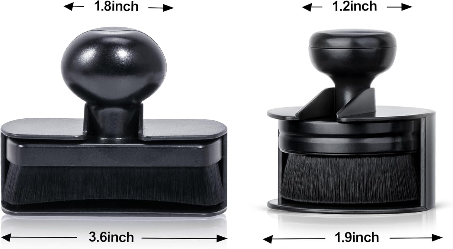 About this item UNIQUE DESIGN, UPGRADED LARGE Package Dimensions with Curved Brush Head: The tire shine applicator brush has been upgraded to 3.6"L x 1.6"W x 3"H, large enough for effective tire shine application. Additionally, the curved brush head design ensures a better fit with your tire's curve. Near zero unwanted splatter means no mess to clean up. More importantly, it applies the tire shine evenly, reaching right up to the rim edge and out to the tread edge. EASY TO USE: This large tire applicator is thick and durable, not like foam applicators that tear easily. Simply squeeze a small amount of tire dressing onto the applicator and spread it over the entire tire. The unique seal handle design features a sealed storage base, making it convenient for storage and use. The ergonomic handle provides control over tire shine and dressings while allowing you to thoroughly cover the area you're applying to. REDUCES PRODUCT WASTE: The fiber-bristle tire dressing applicator brush absorbs less than most foam applicators on the market. The dense bristles hold the dressings effectively, reducing the waste of your product. The stamp-shaped handle grants precise control to apply tire polish or repair compounds without wasting product. NO DIRTY HANDS: Using the correct applicator for tire repair compounds is essential for an even, smooth, smudge-free application. Regular applicators can leave grease and grime on your hands, but the unique handle design of this brush keeps your hands clean. WASHABLE AND REUSABLE: The tire dressing applicator features an ABS plastic handle and vegan fiber, making it washable and reusable. Allow it to dry completely before reuse. ESSENTIAL IN CAR CLEANING KIT: This tire shine applicator brush works perfectly with your favorite tire shine, spray, dressing, protectant, or other car essentials for optimal application. A must-have addition to your detailing kit. Package Dimensions: 3.6"L x 1.6"W x 3"H.