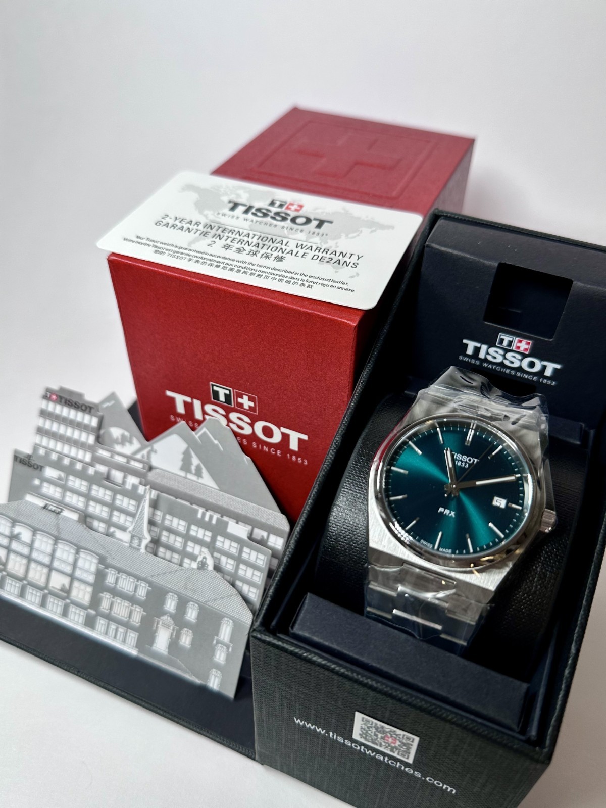 FAST 1-4 BUSINESS DAYS DELIVERY FROM SOUTH FLORIDA Case Case Diameter 40 mm Case Thickness 10.4 mm Case Material 316L Stainless Steel Case Shape Tonneau Case Back Solid Band Band Material Stainless Steel Band Type Bracelet Band Color Silver-tone Band Width 12 mm Clasp Butterfly clasp with push-buttons Dial Dial Color Green Type Analog Crystal Scratch Resistant Sapphire Hands Luminous Silver-tone Dial Markers Index Second Markers Minute Markers around the outer rim Luminiscence Hands and Markers Bezel Fixed Bezel Color Silver-tone Bezel Material Stainless Steel Information Brand Tissot Collection Name PRX T-Classic Gender Mens Model T1374101109100 Watch Label Swiss Made Movement Quartz Features Water Resistance 100 meters / 330 feet Calendar Date display at the 3 o'clock position Functions Date, Hour, Minute, Second Watch Features Analog, Stainless Steel