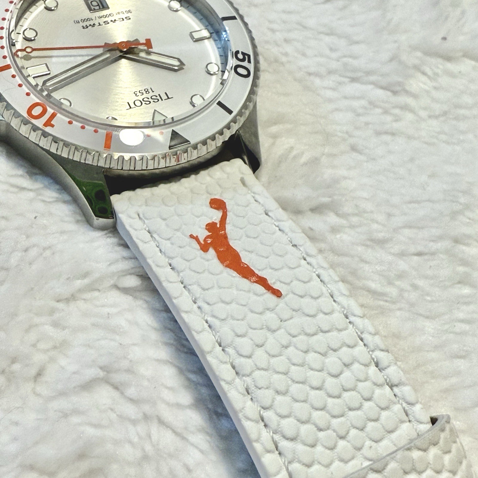 The Tissot Seastar 1000 Quartz Wilson WNBA Unisex Watch is a stylish and reliable timepiece suitable for both men and women. Featuring a battery-operated quartz movement, this watch offers accurate timekeeping. The watch comes with a 2-year warranty by WatchMaxx, ensuring peace of mind. With a sleek white face and synthetic band, this unisex watch is perfect for everyday wear or sports activities. The stainless steel case with a brushed and polished finish adds a touch of elegance to the overall design. The unidirectional rotating bezel and solid caseback enhance its functionality and durability. Item is like new without box and in excellent condition.