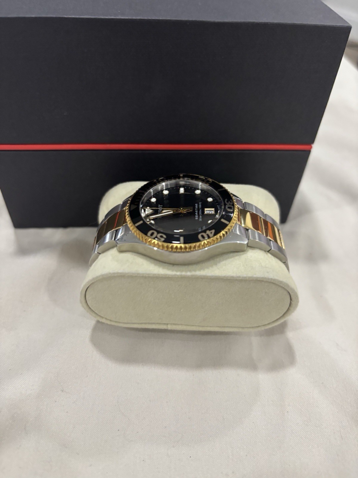 The Tissot Seastar 36mm Quartz Watch with a black dial and 2-tone gold accents is a stylish and versatile timepiece suitable for both men and women. Featuring a reliable quartz movement, stainless steel case and band, and a unidirectional rotating bezel, this watch offers durability and functionality. This 2020 model comes complete with original box and packaging, as well as a manual/booklet for easy use. A classic choice for everyday wear, this watch is a timeless piece from the trusted brand Tissot.