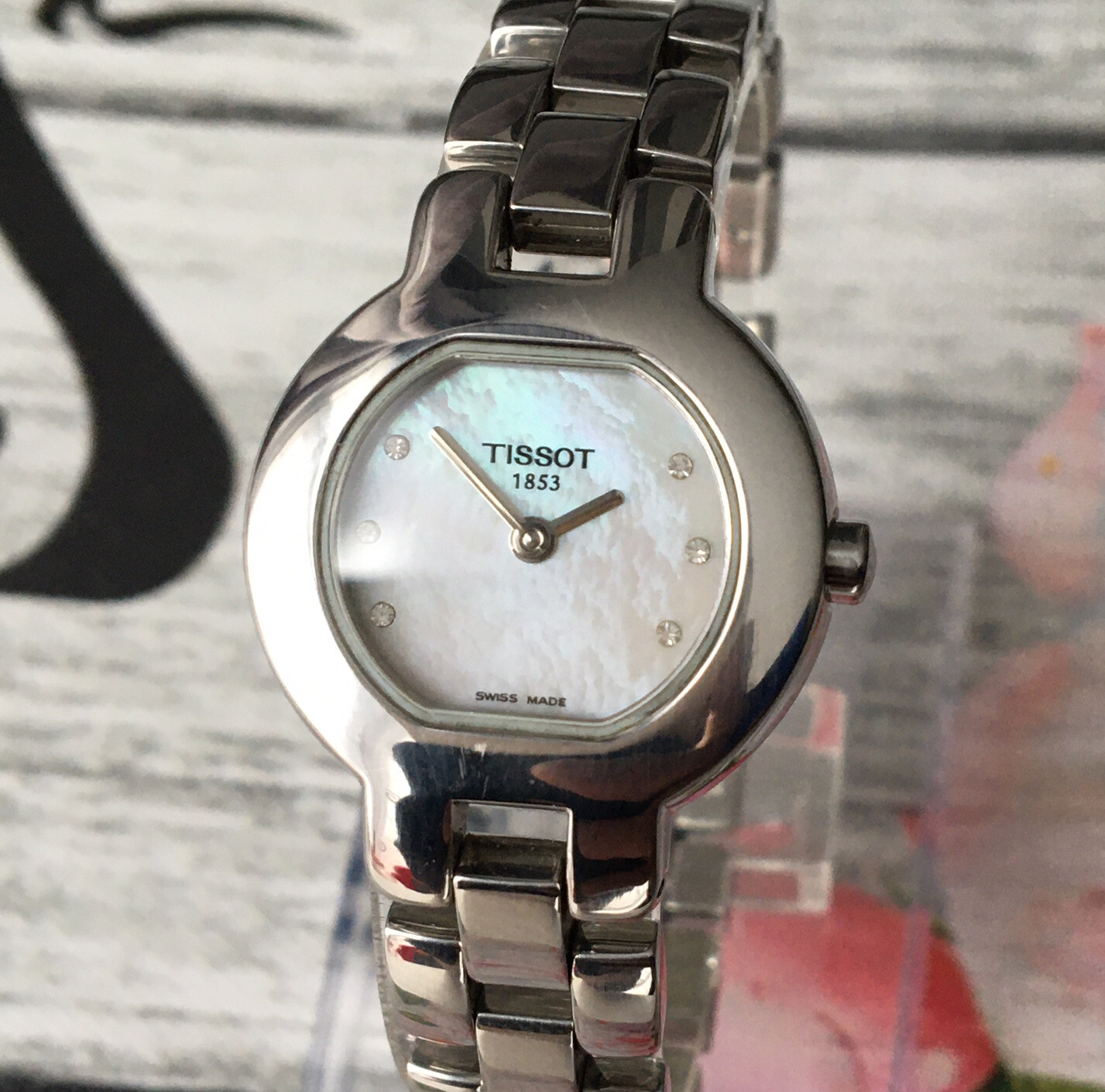 Tissot Watch Swiss Ladies 24mm All Steel Sapphire Glass Diamonds and MOP Dial. A stunner of a watch featuring a mesmerising iridescent mother of Pearl dial studded with diamonds. The watch is in excellent condition for pre-owned negligible blemish under scrutiny. The sapphire glass is in perfect condition. Original signed bracelet will fit up to a 6.5 inch wrist. A fresh battery has been installed and resealed. The case measures approximately 24mm excluding the crown. No original box or papers Will be sent in an aftermarket box for safe transit. PLEASE NOTE DUE TO CONTINUED DELAYS, LOST POST AND CUSTOMS ISSUES I DO NOT POST TO AFRICA, SOUTH AFRICA, ITALY, ISRAEL, GERMANY AND SOME OTHER DESTINATIONS SO PLEASE CONFIRM YOUR DESTINATION BEFORE BIDDING.