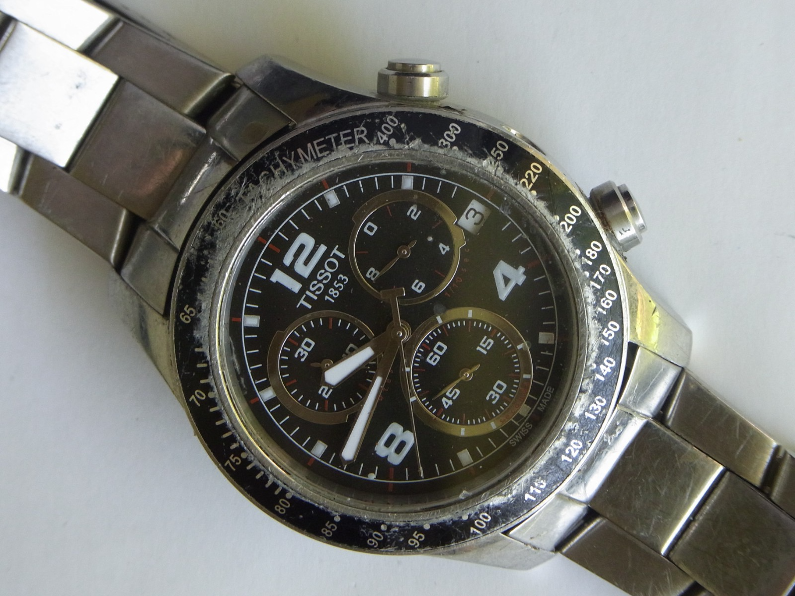 Hour Marker Color: White Style: Diver, Sport, Casual Reference Number: T039417 Dial Ring Color: White Case Color: Silver Closure: Deployant Manufacturer Case Color: Silver Case Size: 42 mm Features: Chronograph Type: Wristwatch Movement: Quartz Display: Analog Watch Shape: Round Bezel Type: Tachymeter Department: Men Bezel Color: Black Dial Numbers: 12, 4, 8 Band Color: Silver Brand: Tissot Indices: Arabic Numerals, Baton Indexes Band Material: Stainless Steel Dial Pattern: Sunburst Hour Hands Color: White Caseback: Solid Dial Color: Black Model: Tissot V8 Manufacturer Dial Color: Black Band/Strap: Bracelet Manufacturer Band Color: Silver Water Resistance: 100 m (10 ATM) Case Material: Stainless Steel