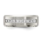 Finish:Polished & Brushed|Stone Type_1:Cubic Zirconia (CZ)|Stone Quantity_1:10|Band Width:8 mm|Stone Setting_1:Channel Set|Material: Primary:Titanium|Stone Shape_1:Square|Stone Size_1:2.5 mm|Stone Treatment_1:Synthetic|Item Weight U/M:gm|Width of Item:8 mm|Packaging:Gift Pouch|Product Type:Jewelry|Jewelry Type:Rings|Sold By Unit:Each|Gender:Unisex|Material: Primary - Color:Grey|Ring Type:Wedding Bands|Stone Creation Method_1:Synthetic All weights and measurements are approximate and may vary slightly from the listed information. Welcome to diamond_6720 Payments We accept all Ebay approved payment. Please sent the payment to us within 8 days after the auction has ended, or you will have unpaid case auto open by eBay. Shipping Policy We will ship all items within 1 business days of purchase during the work week (M-F) excluding holidays. If you order on Friday, your order will be shipped the following business day. Tracking will be provided when it becomes available. We will only ship to a PayPal Verified Address. Please make sure your address is current and correct. If the information does not match, your order may be canceled. Buyers are responsible for all customs, duties and taxes for your respective countries. Delivery times for International Shipping will vary. California Buyers Pay 9.0% Tax on all orders. case auto open by eBay. Return Policy & Exchange Returns or Exchange are accepted. Buyer must contact us within 30 days after the item is received. Item must be returned in unworn and resalable condition. We will only issue a refund for the purchase price, excluding any shipping fees. If we are at fault, we will provide a full refund. Buyer is responsible for all return shipping costs. BUYERS FEEDBACK If you have any concerns regarding your purchase, please contact us via eBay Message, we assure you that a satisfactory resolution will be reached. Your feedback is very important to us Do remember to give us 5 star rating(*****) if you are satisfied with our product & service .