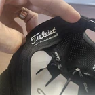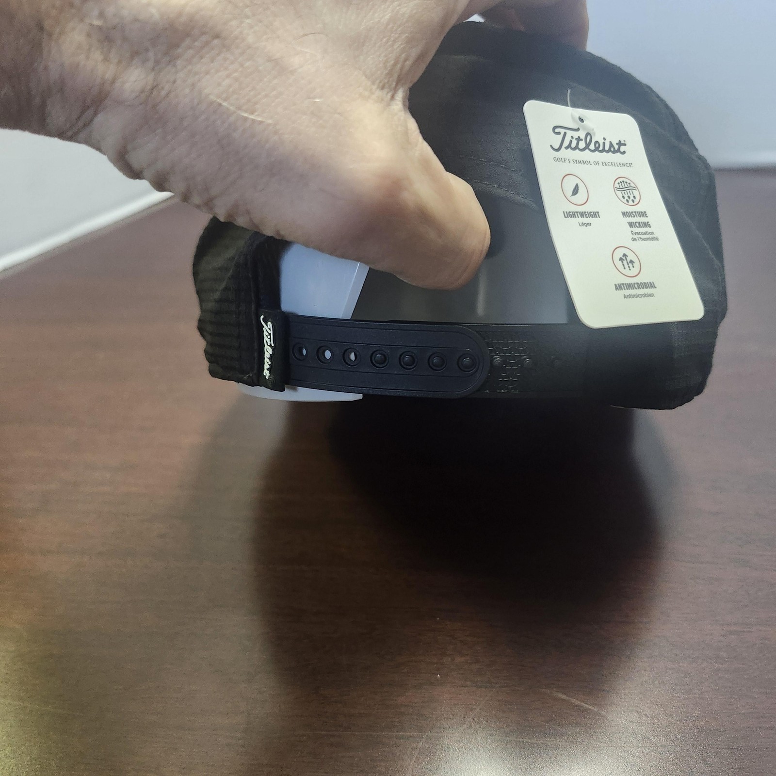 Brand: Titleist Style: Mens golf hat cap with structured front panel and flat bill, featuring a raised Titleist logo patch on the front and Hunton logo embroidery on the left side. Color: Black Size: One size with adjustable snap back closure. Material/Construction: Lightweight, perforated mesh-style performance fabric designed for breathability and comfort. Details: Titleist branding on front, back strap, and interior taping; moisture wicking and antimicrobial properties noted on hang tag; snap back adjustment for a customizable fit. Ideal for golf and casual wear.