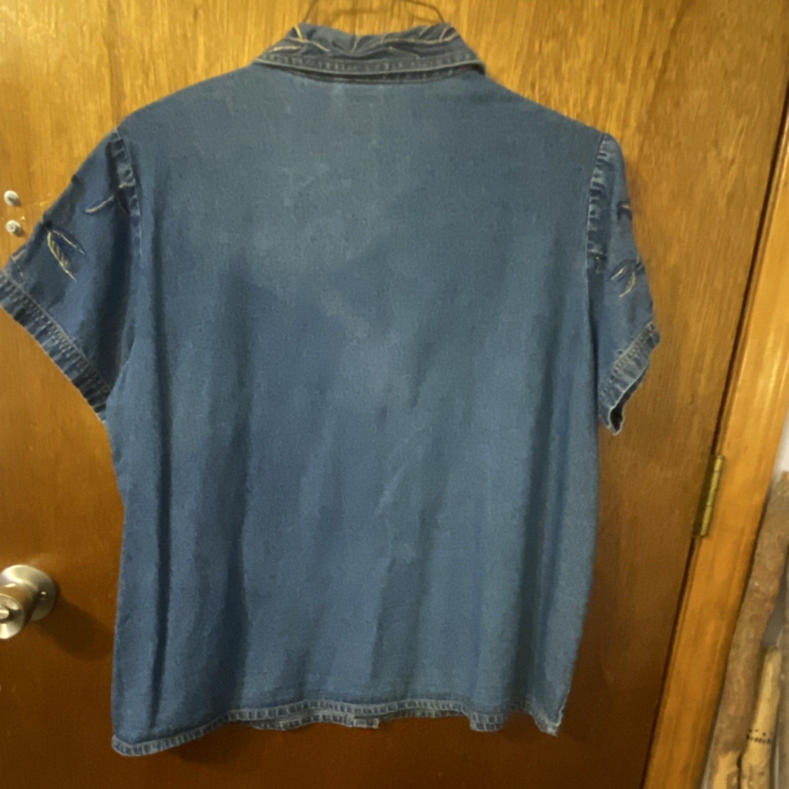 Together Blue Denim Floral Embroidered Collared Button Blouse Short Sleeve 2X