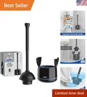 Toilet Plunger with Holder, Heavy Duty Toilet Plunger and Holder Combo for Bathroom Cleaning, Black ELEGANT DESIGN & SPACE SAVING - toilet plunger set features a heavy duty toilet plunger with ergonomic handle and a durable holder with upgraded ventilation system. The holder keeps rubber plunger head out of sight, keep your bathroom neat and well organized. Elegant and stylish design works for any bathroom, it's a must-have accessory for your toilet cleaning. HEAVY DUTY TOILET PLUNGER - This heavy duty toilet plunger is built with commercial grade rubber but won't damage your toilet bowl. The durable suction cup provides maximum plunging power for clearing tough toilet clogs, while its extended rubber can also be collapsed to clear drain clogs. Ideal for residential, commercial, and industrial applications. STURDY & ERGONOMIC HANDLE - Features a thick and solid handle which fits comfortably in hand and ensures a secure grip while cleaning. Wide and flat-top handle provides larger surface to press against for leverage and allows for powerful plunging, leaves your toilet bowl spotless and sanitary. UPGRADED VENTILATION DESIGN - Lid opens automatically when plunger is lifted, press handle slightly when placing plunger back into holder to close the lid. Upgraded ventilation allows for quick evaporation even when the lid is closed and provides hygienic air dry. 's mission: Make your housework easier, and make the world cleaner.