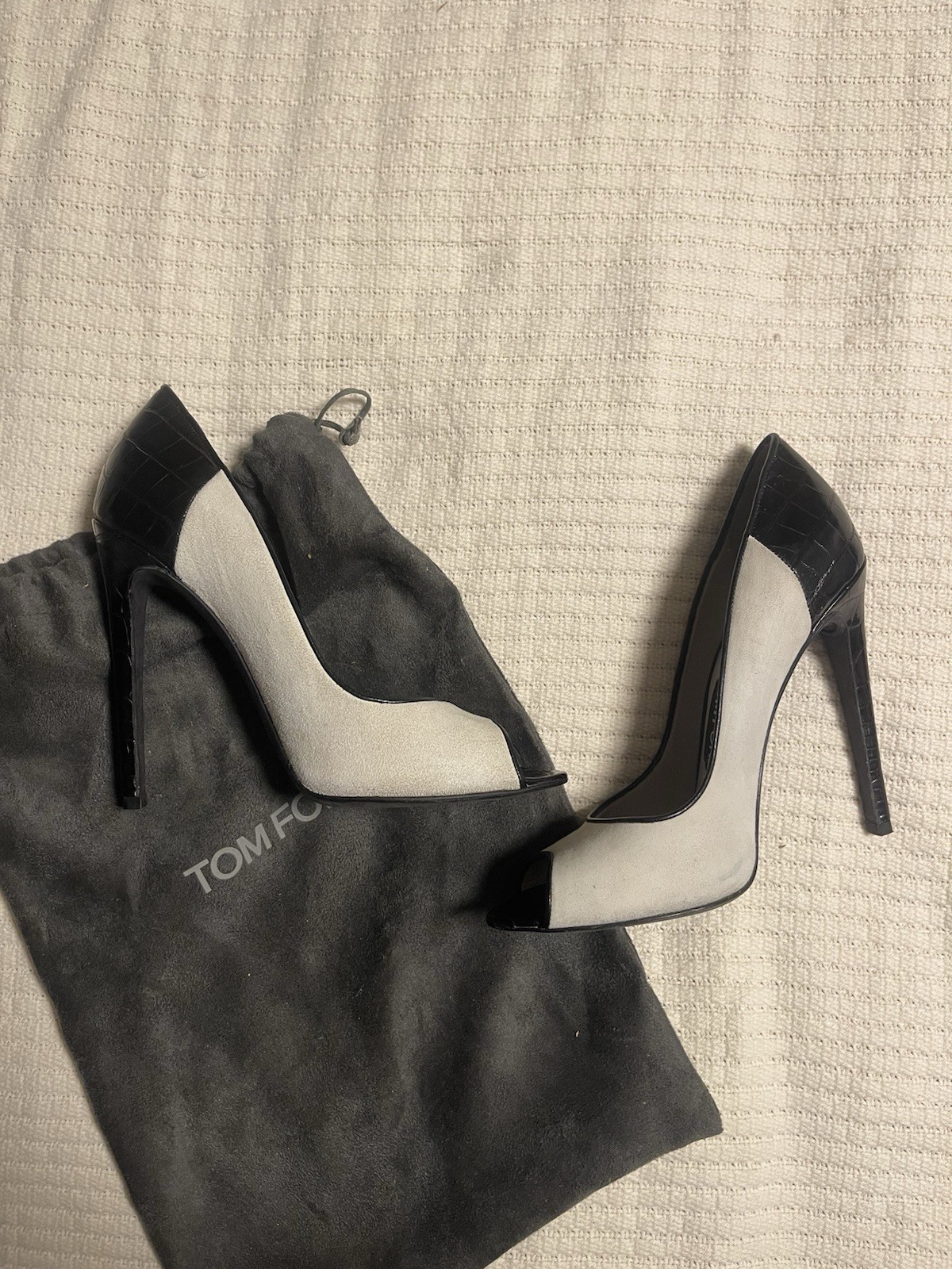 The Tom Ford heels are a stylish and luxurious option for women looking to make a statement with their footwear. With a sleek black color and stiletto heel, these pumps are both elegant and chic. Made from high-quality leather and suede materials, they are sure to provide both comfort and durability for any outfit or occasion. Perfect for adding a touch of sophistication to any wardrobe, these Tom Ford heels are a must-have for any fashion-forward individual.