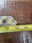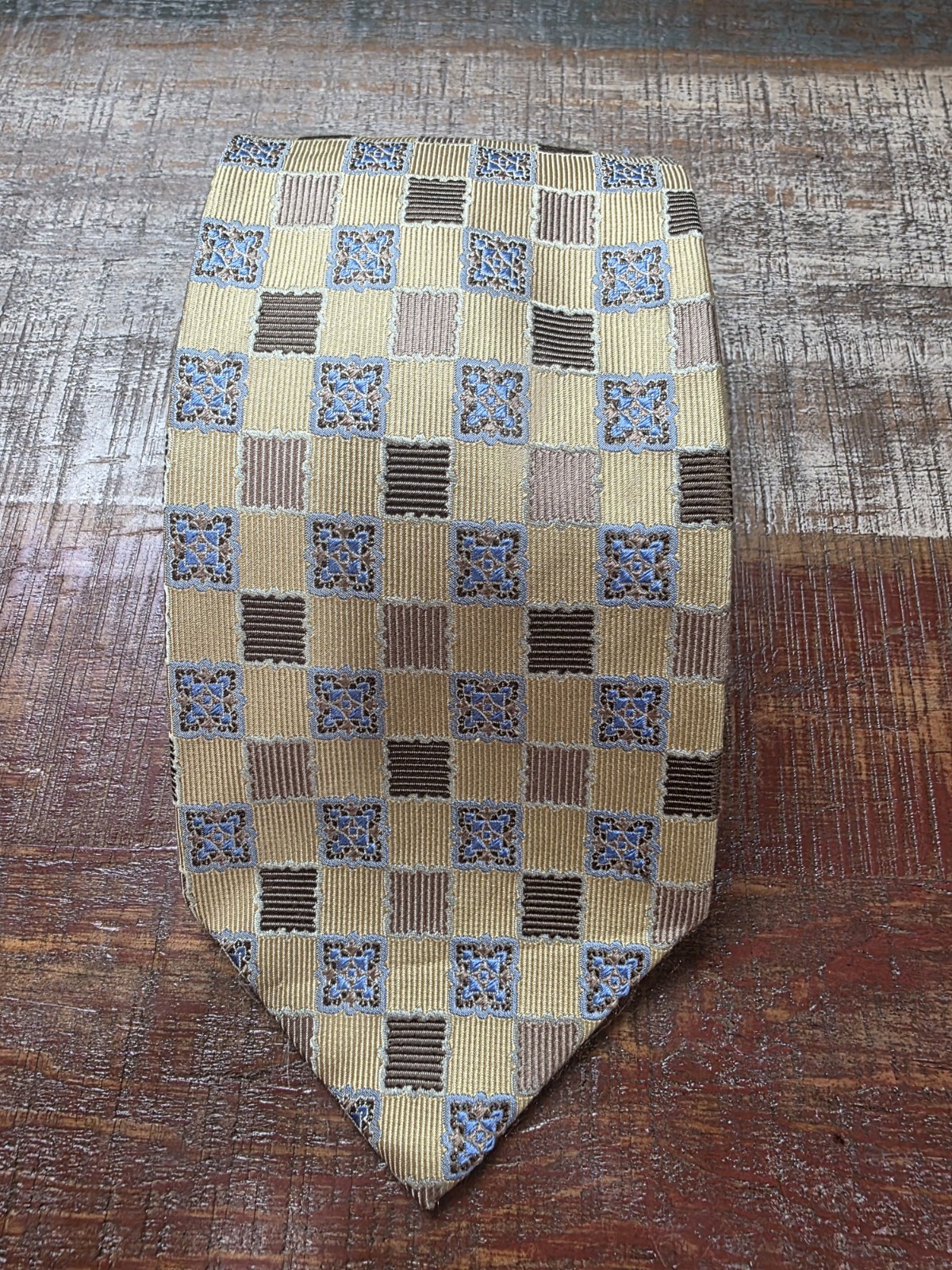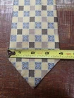 Brand: Tom James Material: 100% Silk Pattern: Geometric / Medallion Checkered Main Colors: Gold, Yellow, Blue, Brown Measurements: Width: Approx. 3.75 inches (at widest point) Length: Approx. 58 inches Condition: Excellent pre-owned condition. No visible stains, snags, or pulls. This high-quality silk tie features a sophisticated textured weave with blue medallion accents and brown/tan geometric blocks. Perfect for business wear, weddings, or formal events. Features: Handmade quality from Tom James Classic width for a traditional professional look Richly textured silk fabric with a heavy, high-quality feel