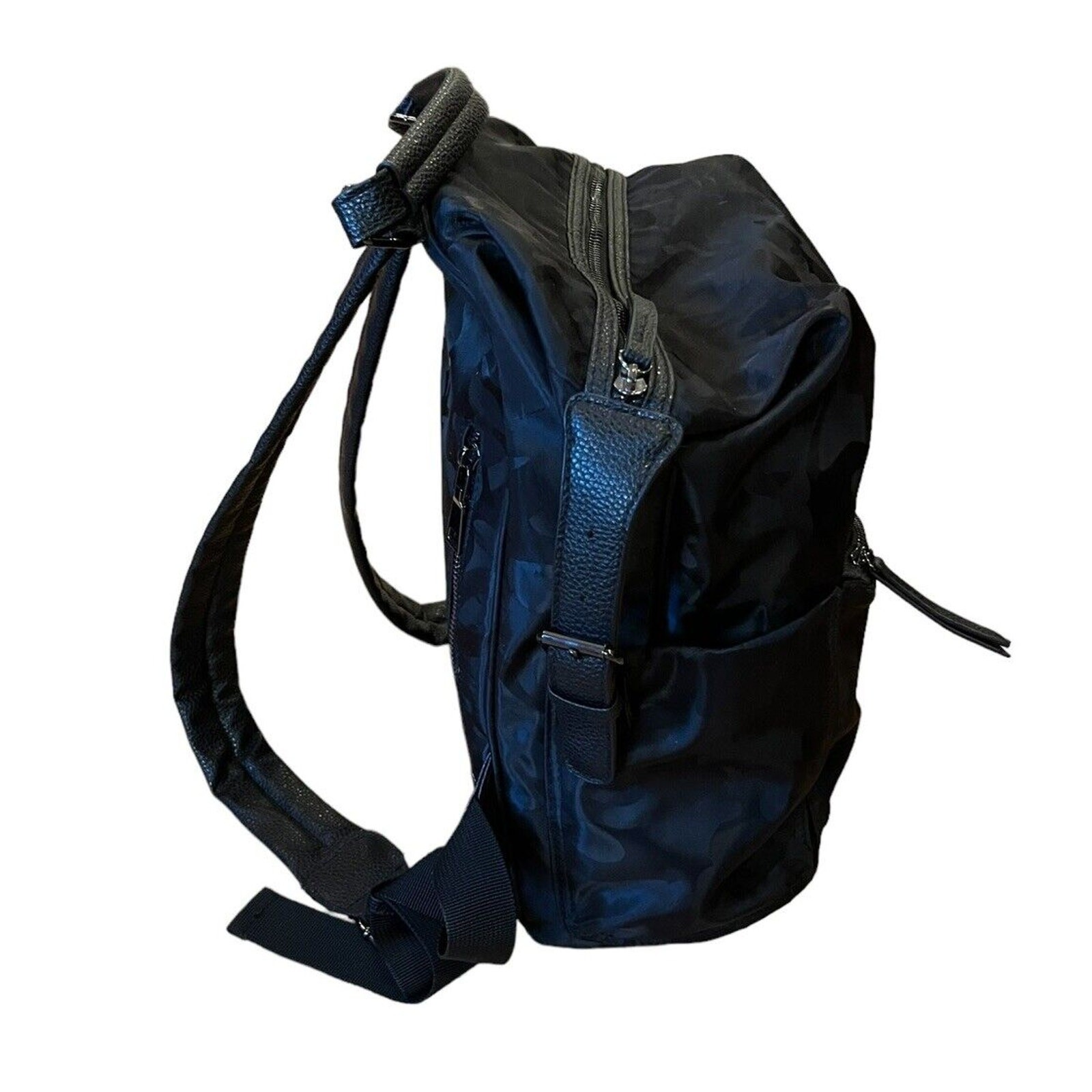 This Tommy Bahama backpack is perfect for any occasion, whether it's for travel, casual outings, workwear, as a stylish diaper bag, gym bag or business settings. The bag has a subtle black camo exterior with silver hardware and features a zip closure. The backpack has a medium size with a width of 11 inches, a height of 13 inches, and a depth of 6 inches. It has black leather straps and a backpack and top handle style. The bag also has bottle pockets and adjustable straps. The lining material is polyamide, and the lining color is black. It is in very nice condition with no flaws to note. The bag is a part of the Tommy Bahama product line, model 75343.