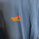 This is a Tommy Bahama T-shirt in size Large, featuring a graphic print with the phrase "In Case Of Fire Bring Steaks" in blue color. Made of cotton knit fabric, it has short sleeves and a crew neck. The shirt is machine washable and has a regular fit, suitable for men. The theme is beach-related, perfect for all seasons. The Tommy Bahama brand logo is also present on the shirt. International charges are the buyer’s responsibility. No international returns.