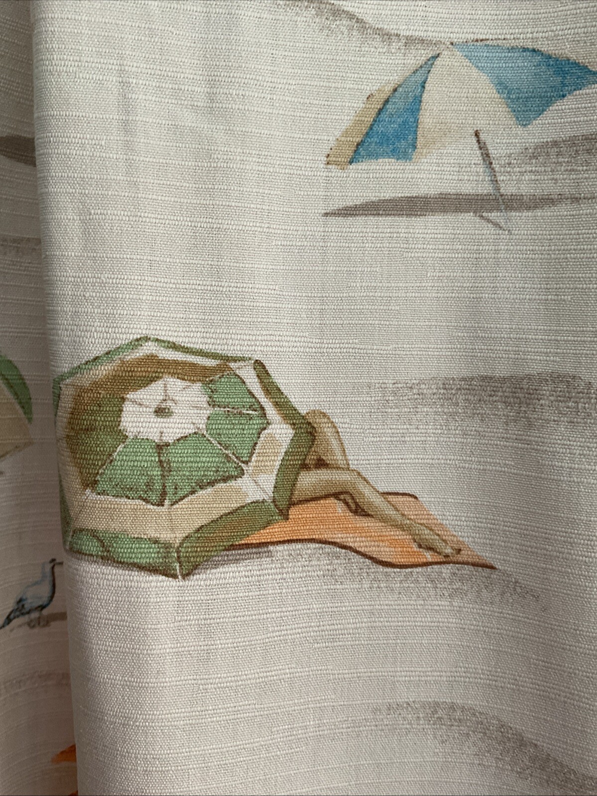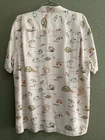 This Tommy Bahama men's camp shirt in size M features a Hawaiian beach scene with umbrellas, seagulls, bathing beauty, beach ball and dogs on a beige silk fabric. The shirt has a collared neckline, short sleeves, a classic fit, and a button-up style. It is designed for all seasons, with a spread collar and a theme inspired by beach and island life. Perfect for casual wear, parties, cocktails, and travel adventures. EXCELLENT CONDITION! Men’s size M Measures LAYING FLAT 23” across the chest 29” length 9.5” sleeves Side slits NO SMOKING HOME NO PET HOME NO COLOGNE HOME