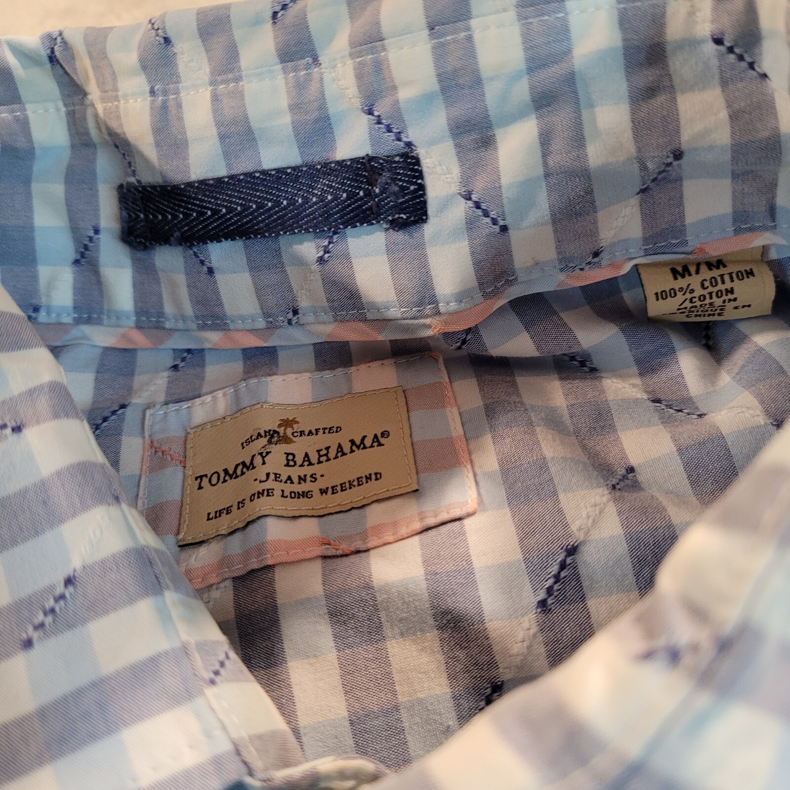 Tommy Bahama Jeans Button Up Shirt Casual Long Sleeve Blue Cotton Mens Size M. Has a nice checkered pattern with a stitched pattern on top. Really good condition. No major flaws please view pictures. I believe this is a Big & Tall medium please compare measurements to a shirt you own. Measurements pit to pit: 23 in Measurements top to bottom: 30 in We do our best to provide accurate descriptions, and measurements. If you have questions please feel free to message. We appreciate your business and strive to ship fast! USED Clothing Disclaimer: Some of our items are sourced from second-hand retailers. Due to people having allergic reactions we only launder clothing if it is absolutely necessary. We recommend washing before wearing. đź§ş Please check out our store for more cool items. We offer combined shipping and discounts for multiple quantity orders. Thanks! Mom code: Tommy Jeans M 9.11