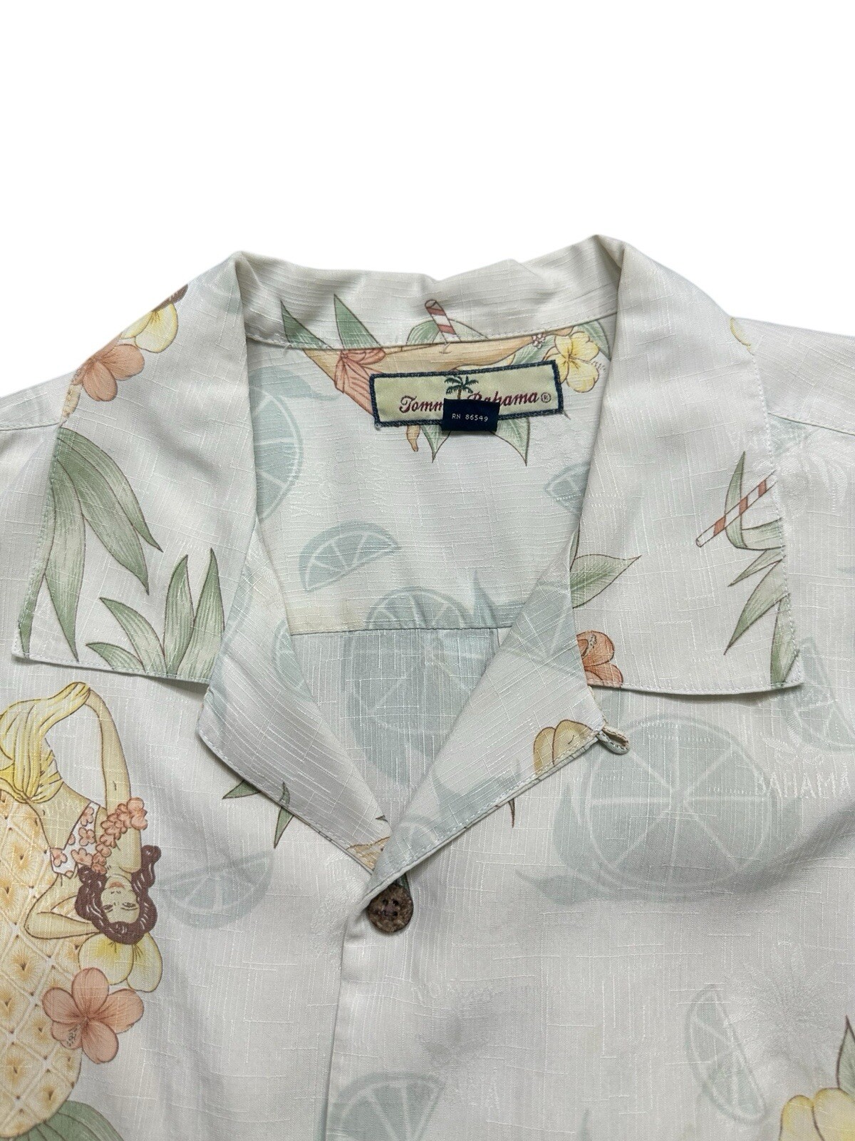 Please see pictures for an accurate description. Same day business shipping. Pet loving smoke-free shipping home. Thank you so much for your interest. If you have any questions, please feel free to ask. Get ready to embrace the tropical vibes with this Tommy Bahama Silk Pineapple Cocktail Hawaiian Bikini Girl Shirt. This shirt is perfect for those who love to add a touch of fun and color to their wardrobe. The shirt features a spread collared neckline, short sleeves, and a button closure. The shirt is made from lightweight and breathable silk knit fabric, which makes it suitable for all seasons. The shirt is adorned with a vibrant multicolor pineapple and pin-up girl pattern that adds a touch of playfulness to your outfit. This regular fit shirt is perfect for men who love to show off their style and personality.