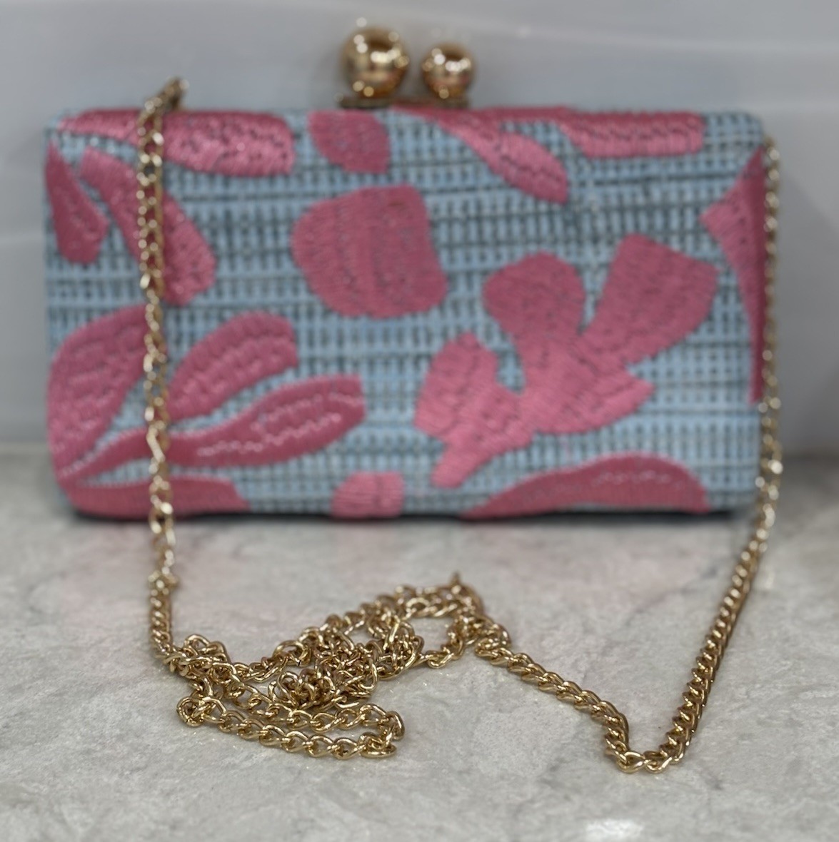Tommy Bahama pink and blue floral clutch / cross body handbag. The bag has a hard case and a gold tone latch that lifts for opening. There is a detachable gold tone metal chain so it can be worn over the shoulder or crossbody. The interior has a beige fabric lining. The bag measures approximately 8” by 4” by 1 1/2”. The bag is preowned and in very good condition. Doesn’t look used.