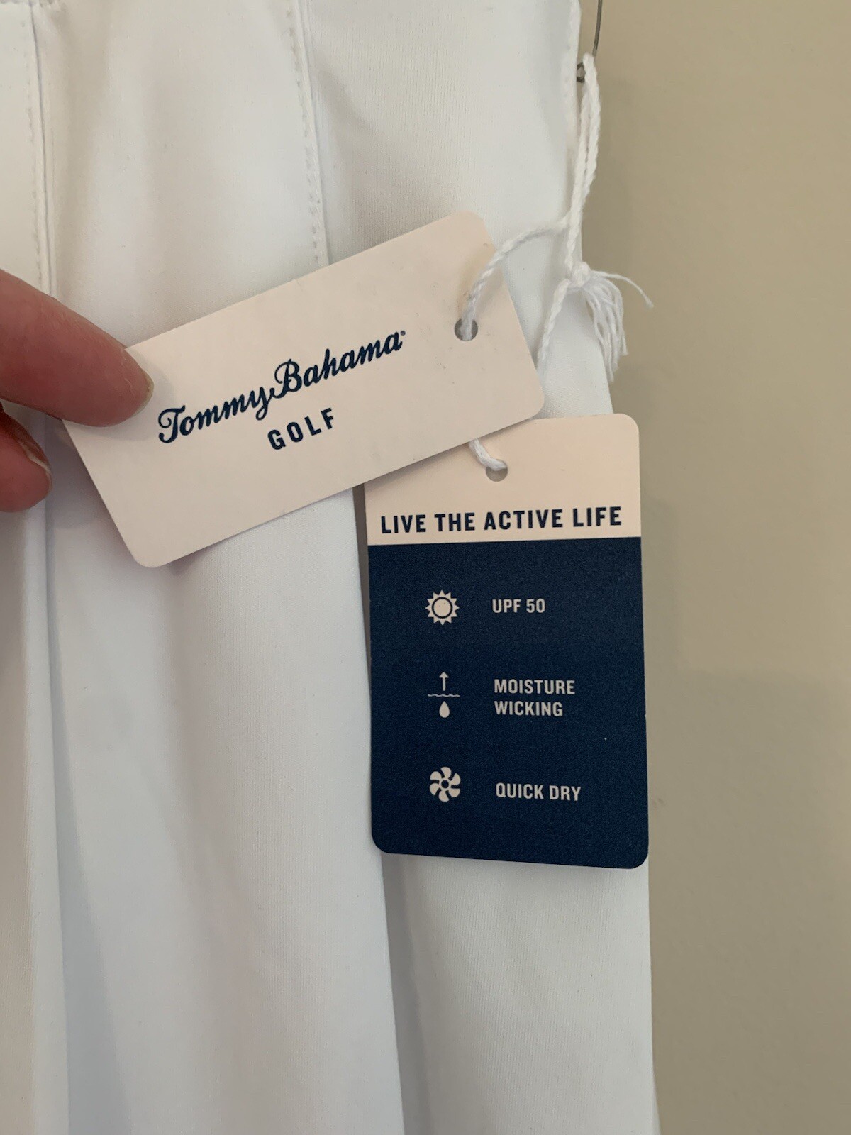 New with tags Tommy Bahama white pleated skirt / skort Golf, tennis, Pickleball, athleisure UPF 50 Moisture wicking, quick dry Size large Approximate measurements 30” waist, 15” length, 4” inseam Small mark on front- see photo.