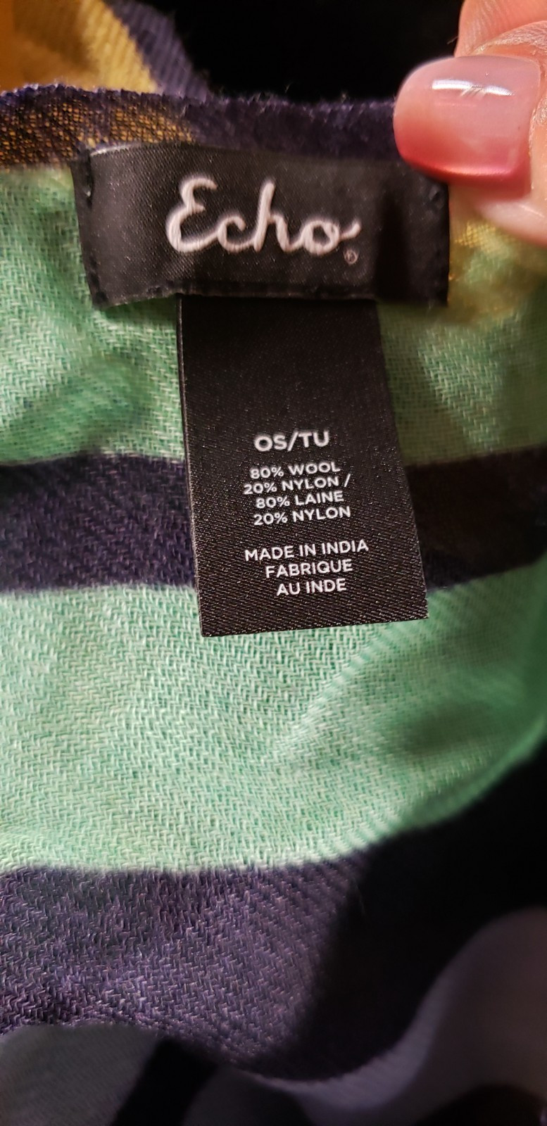 This Echo women's wool blend Ccolor block stripe NWOT rectangle scarf was purchased at Tommy Bahama to coordinate with the Tommy Bahama corduroy women's shirt on my listing sold seperately. •80% Wool 20% Nylon • Made in India •Hand-wash cold, hang to dry, cool iron when needed • 70 inches long x 28.5 inches wide • Retail: $110