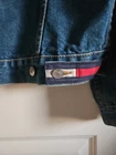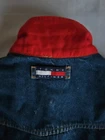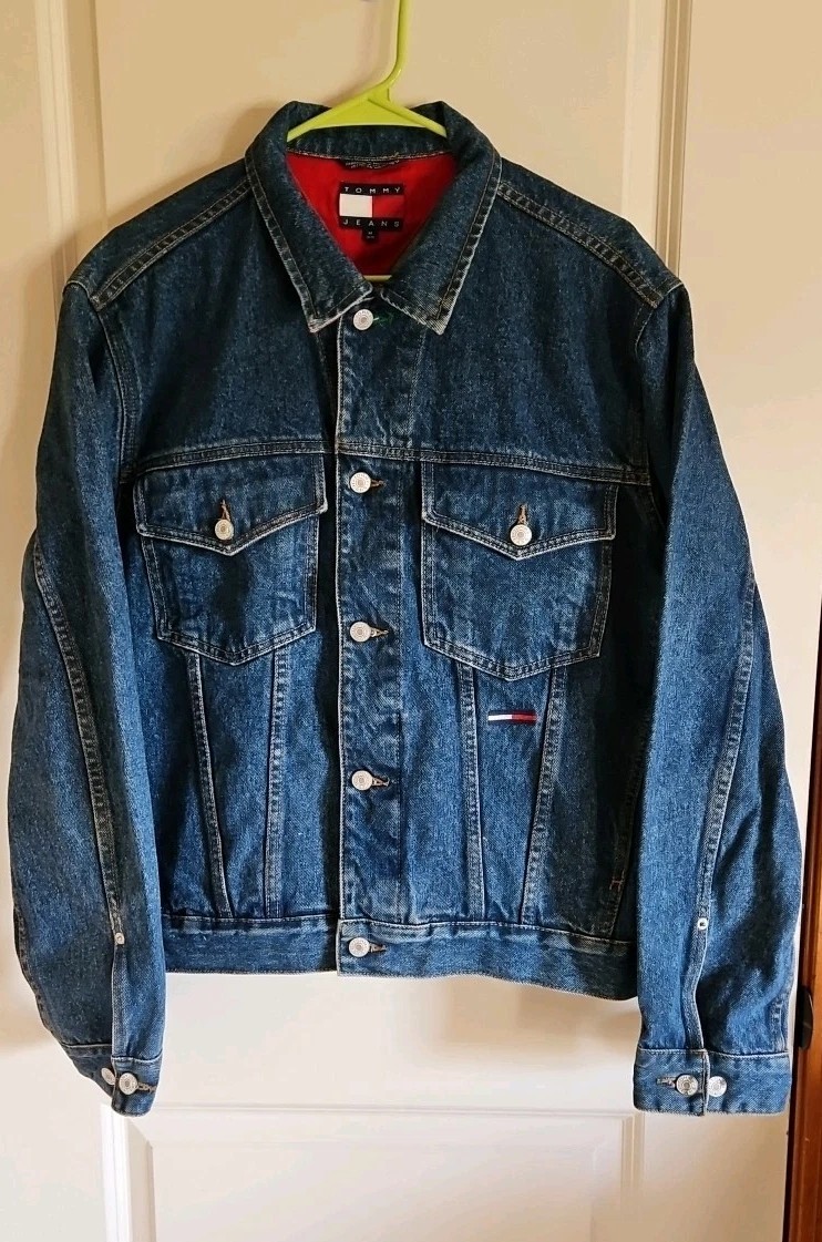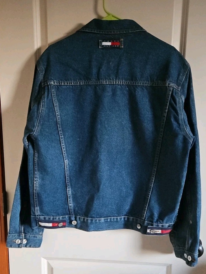 This Tommy Hilfiger denim jacket from the 1990s is a vintage piece with a hip-hop look, featuring red nylon trim and a bold blue color. Made from denim with a regular fit, this jacket is a stylish and unique addition to any man's wardrobe. With a medium size and a chest size of 46 inches, it is perfect for everyday wear and adds a retro touch to any outfit. Made in Mauritius, this original Tommy Hilfiger jacket combines classic style with a modern twist. Pre-owned Excellent Condition