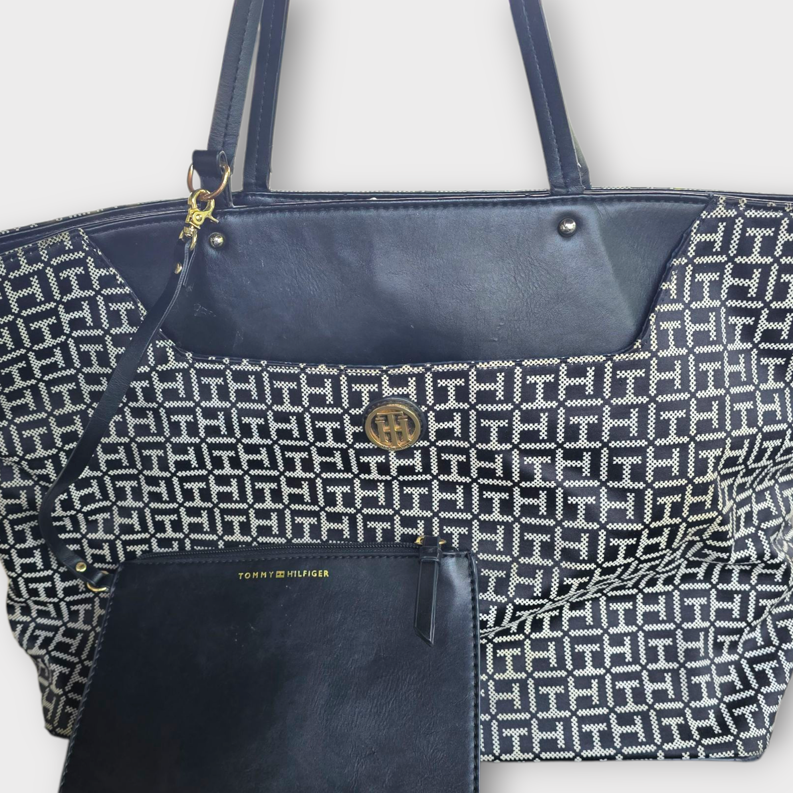 Matching wristlet fits right in the front pouch for a sleek look and its removable as well with clip. Top of the handle of this bag is slightly damaged Please review last photo of this flaw up close. Color is navy blue.