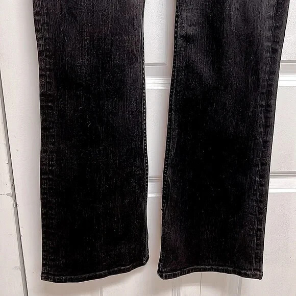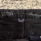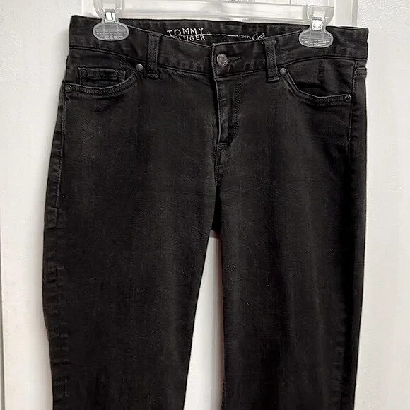 The Tommy Hilfiger Black Denim Low Rise Stretch 5 Pocket Curve Jeans are a classic and Gothic themed pair of women's jeans. They are made of machine washable dark denim fabric and feature a 5-pocket design with a button and zipper closure. The jeans have a low rise and a curvy fit with a bootcut style and a 31-inch inseam. They also come with embroidered logos, belt loops, and are breathable and comfortable due to their stretchy fabric. These jeans are perfect for all seasons and are made in India. Lightly faded overall good Pre Owned Condition 98% cotton 2% spandex stretch denim 29’ around waist 38’ around hips 8’ front rise 31’ leg inseam 18’ around leg bottom nice for casual wear
