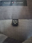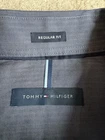 Tommy Hilfiger Blue Long Sleeve Button Down Shirt in size M with a collared neckline measured at 15/15.5 and 34/35. Made of 100% cotton, this shirt features a solid pattern, a front pocket, and is suitable for casual, formal, or business occasions. The shirt is part of the Tommy Hilfiger product line and is designed for a regular fit. There is a Tommy Hilfiger flag insignia detail on one of the cuffs.