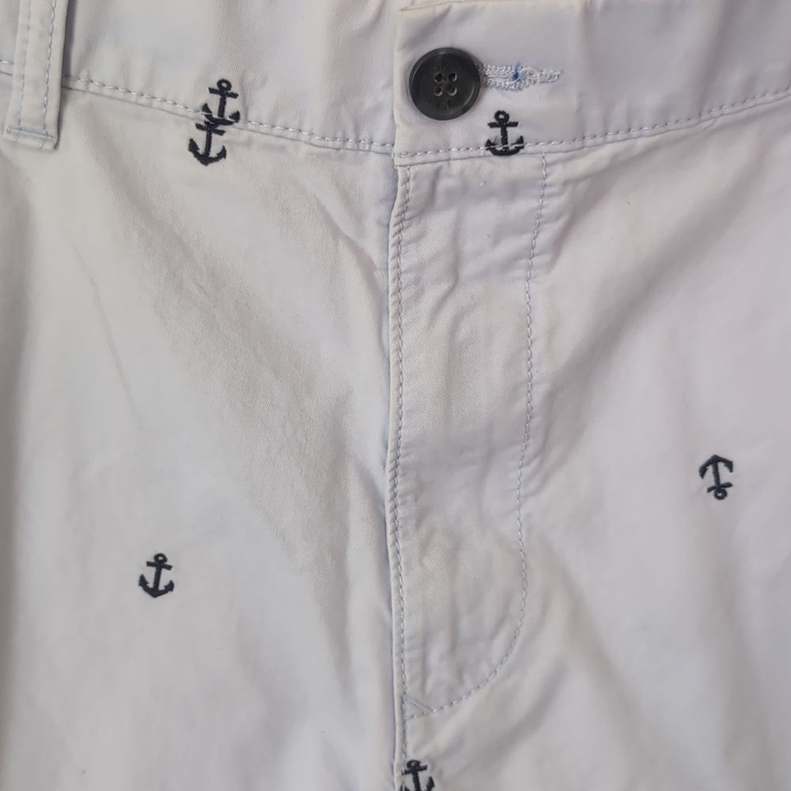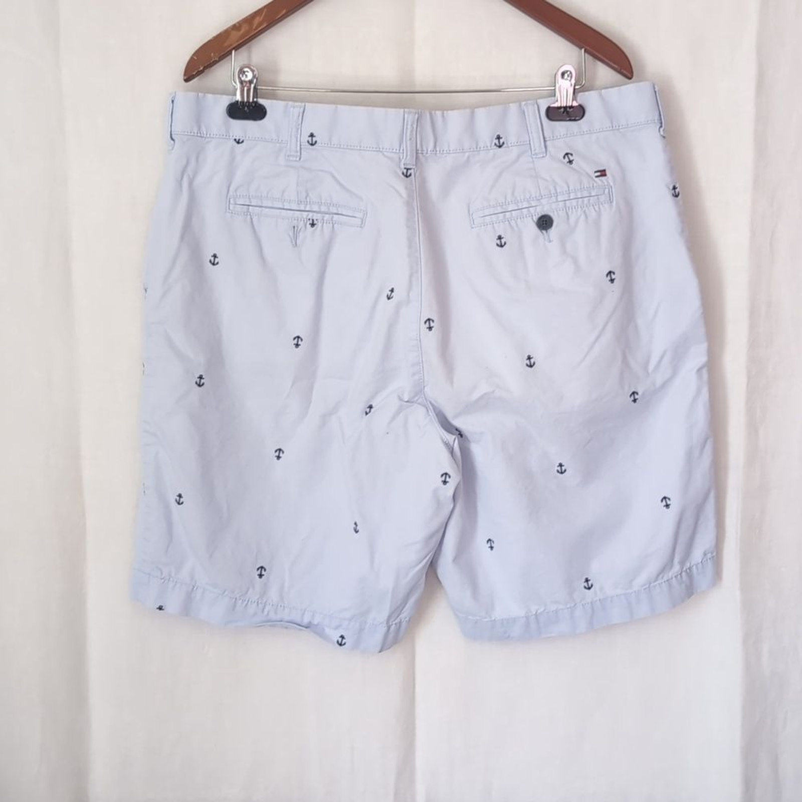 Tommy Hilfiger size 38 classic fit shorts pale blue base embroidered navy blue anchors allover button fly closure slit front pockets buttoned back pockets 100% cotton small bleach spot on leg otherwise excellent condition measurements waist lying flat 19 rise 11.5 inseam 9.5