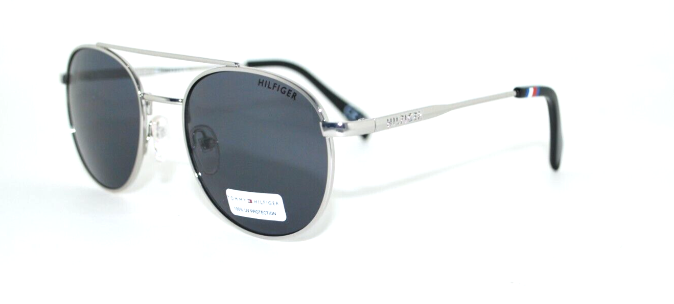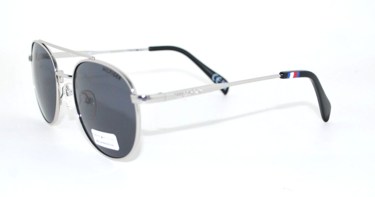 Elevate your style with these Tommy Hilfiger Dara aviator sunglasses. With a silver metal frame and gray polycarbonate lenses, these sunglasses are perfect for both men and women who want to protect their eyes from harmful UV rays while maintaining a fashionable look. The anti-reflective lens technology ensures that your sunglasses will provide clear vision in low light conditions. These sunglasses come with a new pouch and are ideal for those who love to travel.