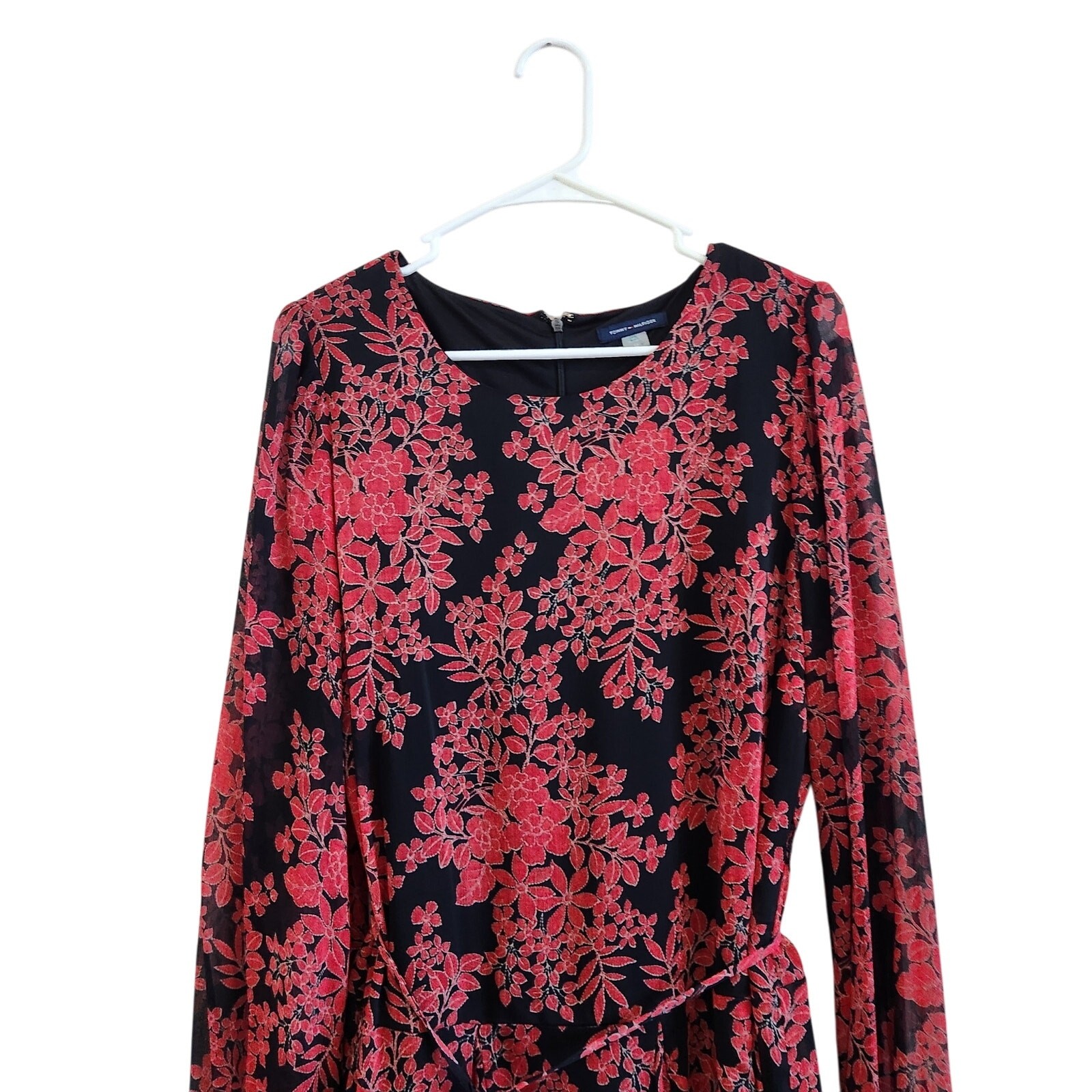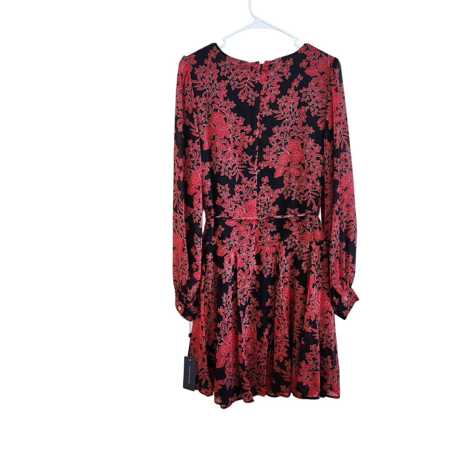Tommy Hilfiger Floral Long Sleeve A-Line Dress Knee Length Red Black Size 12 Condition: New With Tags but one belt loop is loose as shown Measurement Chest: 22" Length: 38" This A-line dress features a round neck with long balloon sleeves and a back zip closure. Floral pattern that adds a pop of color to your wardrobe. floral, formal, preppy, knee length, a line, spring, black tie