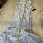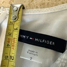 This Tommy Hilfiger dress is a new-with-tags gray maxi dress featuring small white floral prints. It has a V-neckline, short sleeves, and a zip closure. The dress is size 2 and made of polyester material with layered accents, giving it a tiered look. Perfect for occasions like travel, weddings, and parties, this flowy and feminine dress exudes a charming and elegant style with a touch of floral theme.