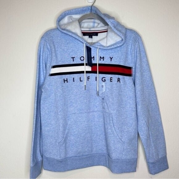 Organic cotton blend flex fleece Drawstring hooded neck Rib-knit cuffs and hem Tommy Hilfiger logo on front 60% Cotton - 40% Polyester Size Medium Measurements in Pictures. NWT A