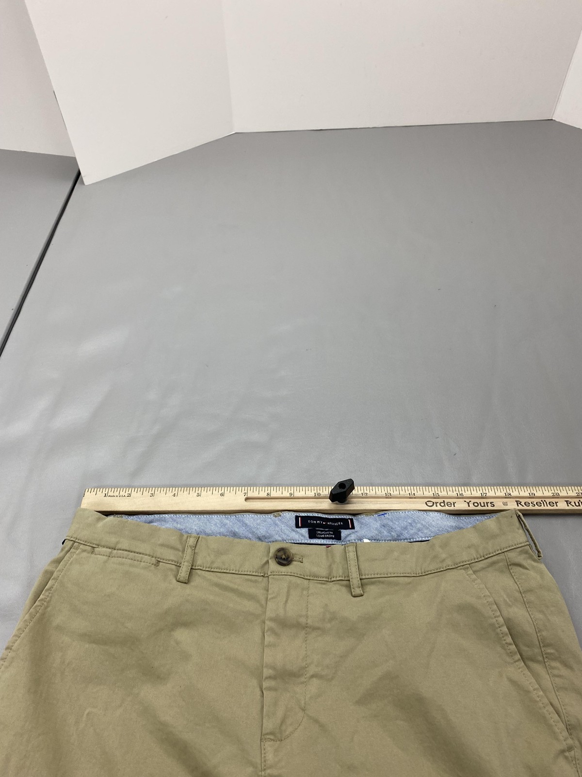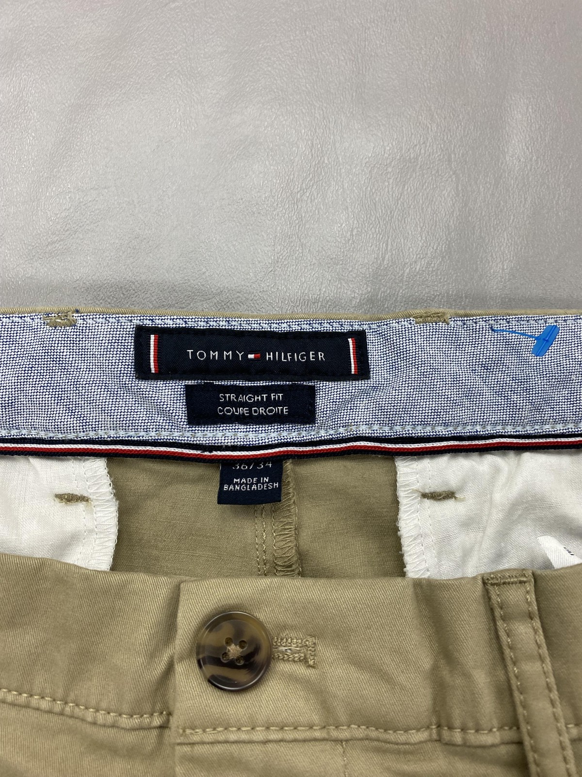 Tommy Hilfiger Pants Mens 36x34 Khaki Straight Fit Chino Casual Stretch Beige Condition: Fair used condition, moderate wear. Multiple black marks/stains present on both leg hems as shown in photos. Wrinkling from storage. No holes or missing hardware. Tag size: 36x34 (measured size appears consistent with tag) Straight fit style, classic Tommy Hilfiger details with button waist and zipper fly Shell: 77% cotton, 20% reprocessed cotton, 3% elastane for stretch comfort Features internal Tommy Hilfiger branded trim and label Main color is beige/khaki Made in Bangladesh Ideal for casual wear, work, or everyday use—see all photos for details of condition