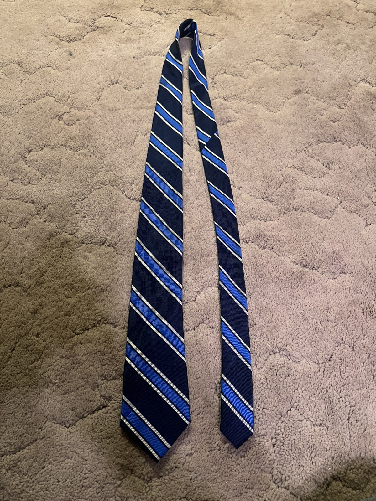 This is a Tommy Hilfiger men's tie made of blue silk with a striped pattern. The tie has a classic width of 3 1/8 inches and features a blue on blue color scheme.