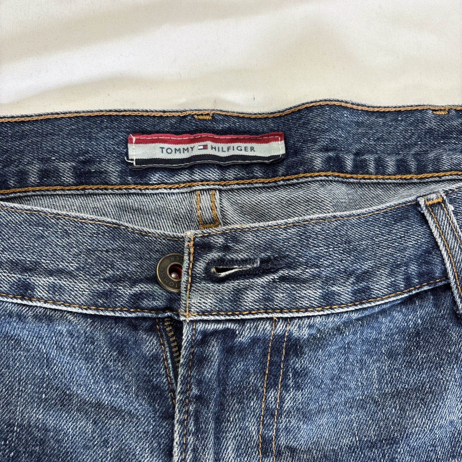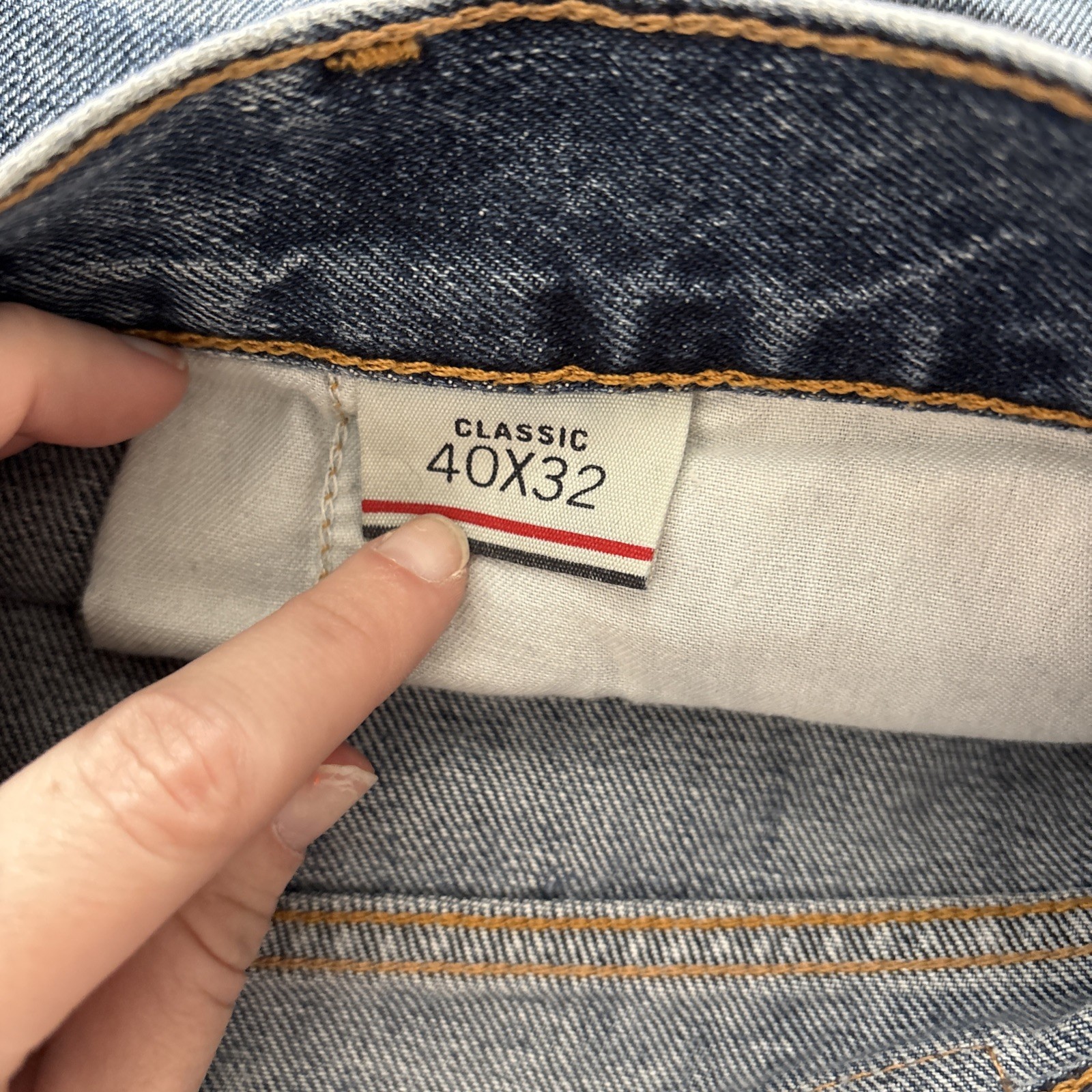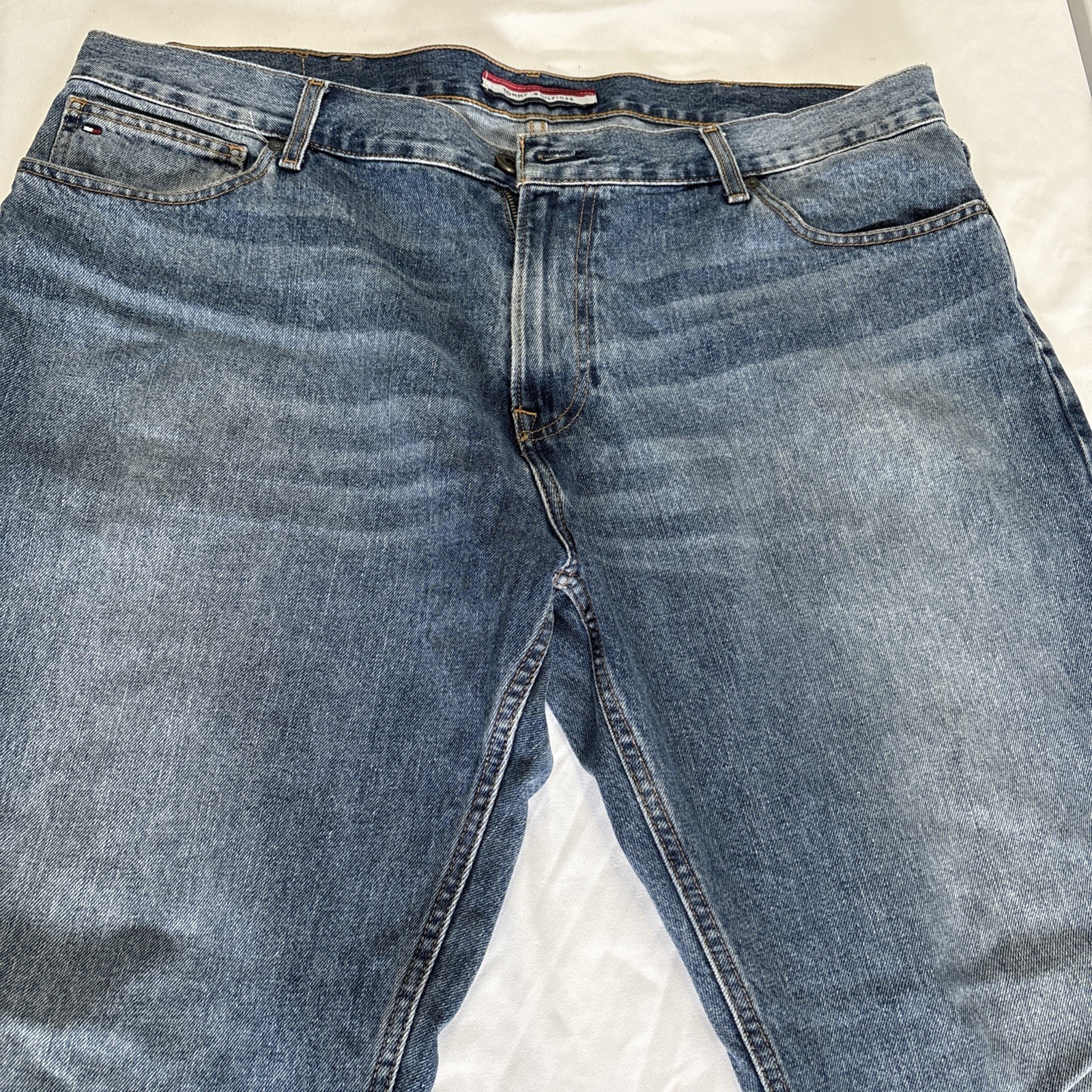 The product is a pair of men's Tommy Hilfiger classic 5-pocket blue denim jeans in a medium wash with a straight style. Made from 100% cotton denim, these jeans feature a zipper fly closure, belt loops, and a classic rise fit. With a waist size of 40 inches and an inseam of 32 inches, these jeans are easy to care for as they are machine washable. The solid blue color and timeless design make these jeans a versatile addition to any man's wardrobe. Box 11