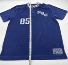 This is a Tommy Hilfiger men's Henley T-shirt in size Large, featuring a blue color with a graphic print design. It is made of a blend of polyester and cotton, has a relaxed fit, short sleeves, and button accents on the neckline. The shirt also includes the Tommy logo, giving it a classic 90s designer theme. Ideal for all seasons, this T-shirt is perfect for a stylish and comfortable look in the spring. Check pictures for flaws and measurements