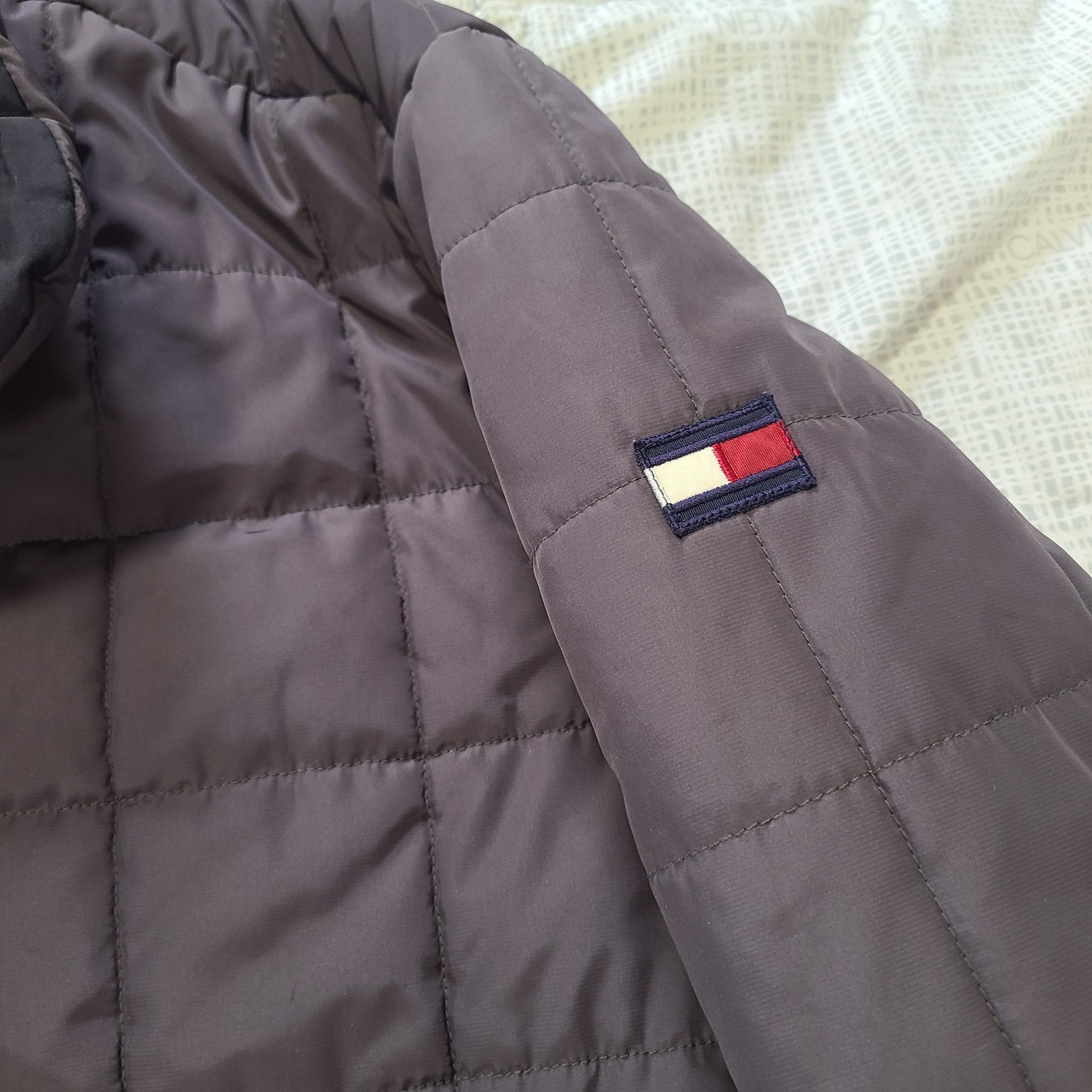 EXCELLENT CONDITION Tommy Hilfiger Men's Puffer Jacket is made of nylon with a quilted design in a gray color. It features a hood, zipper, and snap closure and is insulated with polyester for warmth in winter. The size is large, and it is designed for casual occasions. Perfect for activities like walking, skiing, or hiking, this jacket offers both style and functionality for the cold weather.