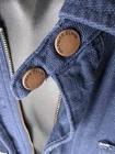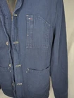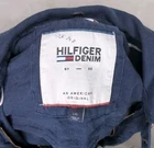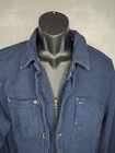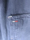 TOMMY HILFIGER CANVAS STYLE UTILITY CHORE COAT ZIP AND BUTTON FRONT CLOSURE FRONT POCKETS BUTTON WRIST CUFFS NAVY BLUE MENS SIZE LARGE 23" ACROSS CHEST LAID FLAT 28.5" LENGTH TOP OF SHOULDER TO HEM