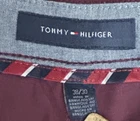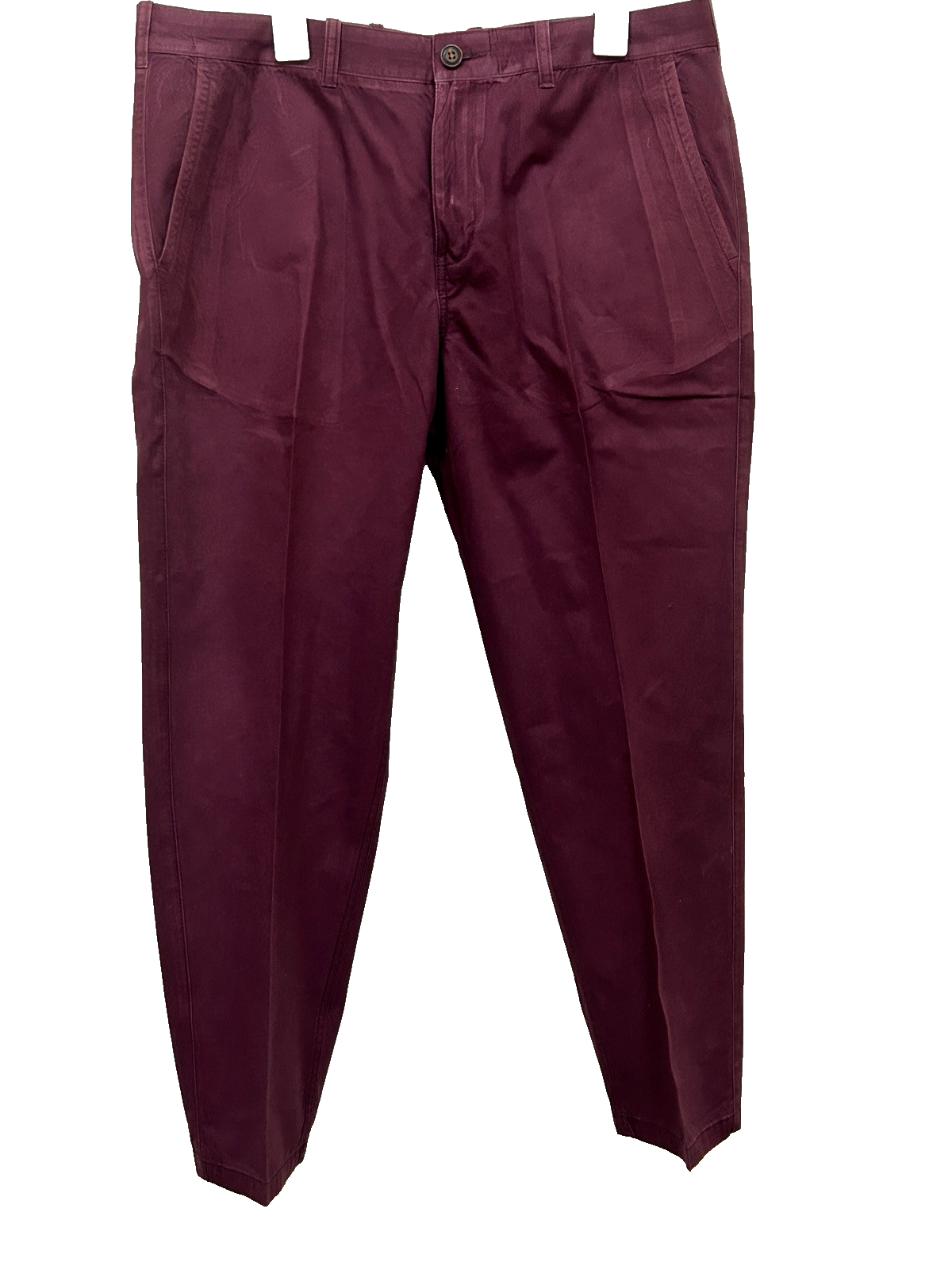 Tommy Hilfiger men's jeans in a rich red maroon hue offer a classic straight fit with pleats. Men's size 38/30. 100% cotton denim promises breathability and durability. With features including front and back pockets for functionality and a solid pattern for versatility, these jeans are machine washable for easy care. Recently ironed.