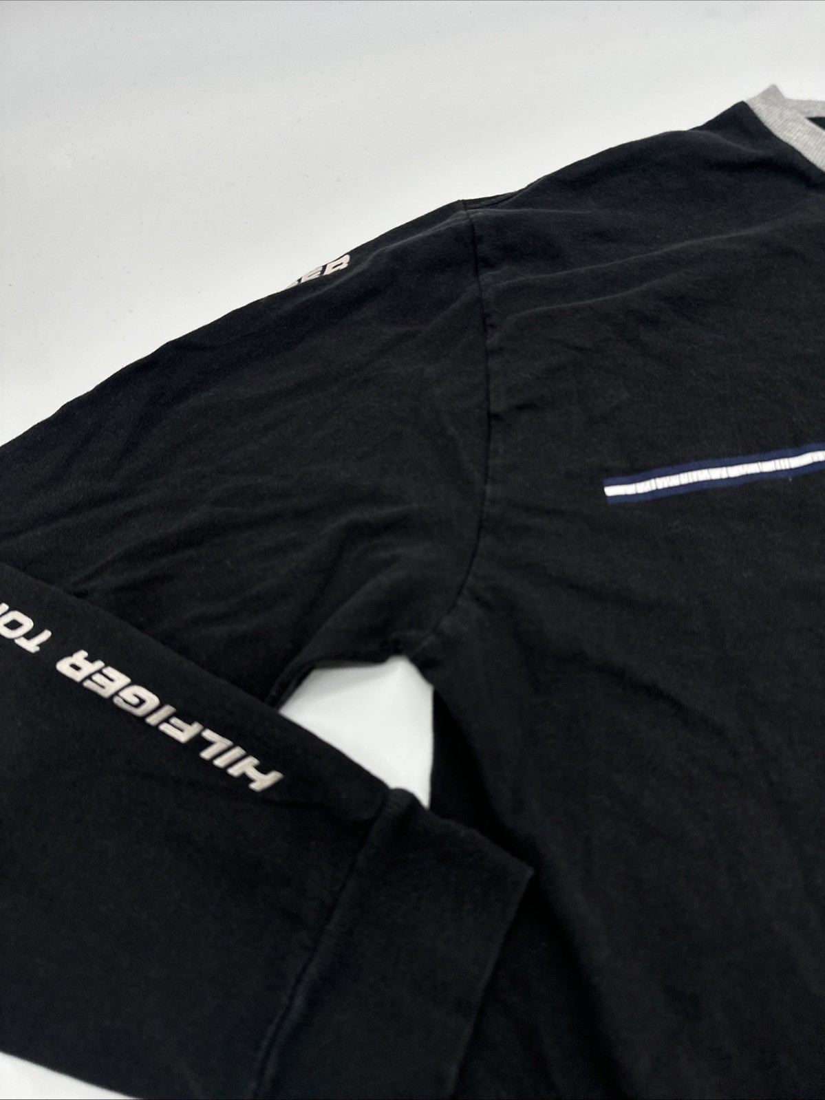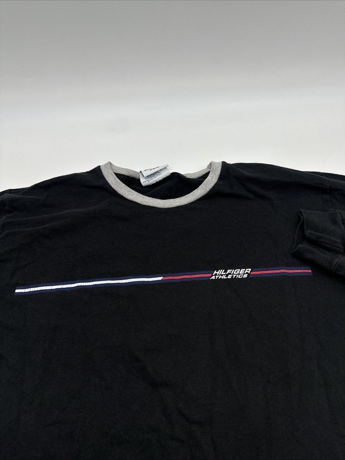 The Tommy Hilfiger Athletics Long Sleeve Shirt for men in size medium features a classic graphic print design with the Tommy Hilfiger logo accent. Made of comfortable cotton material, this black shirt is designed with a crew neck and athletic fit for a stylish and casual look. Ideal for everyday wear, this easy-care shirt is perfect for those who appreciate quality and timeless style in their wardrobe. *Check the images above for the flaws and measurements of the item.